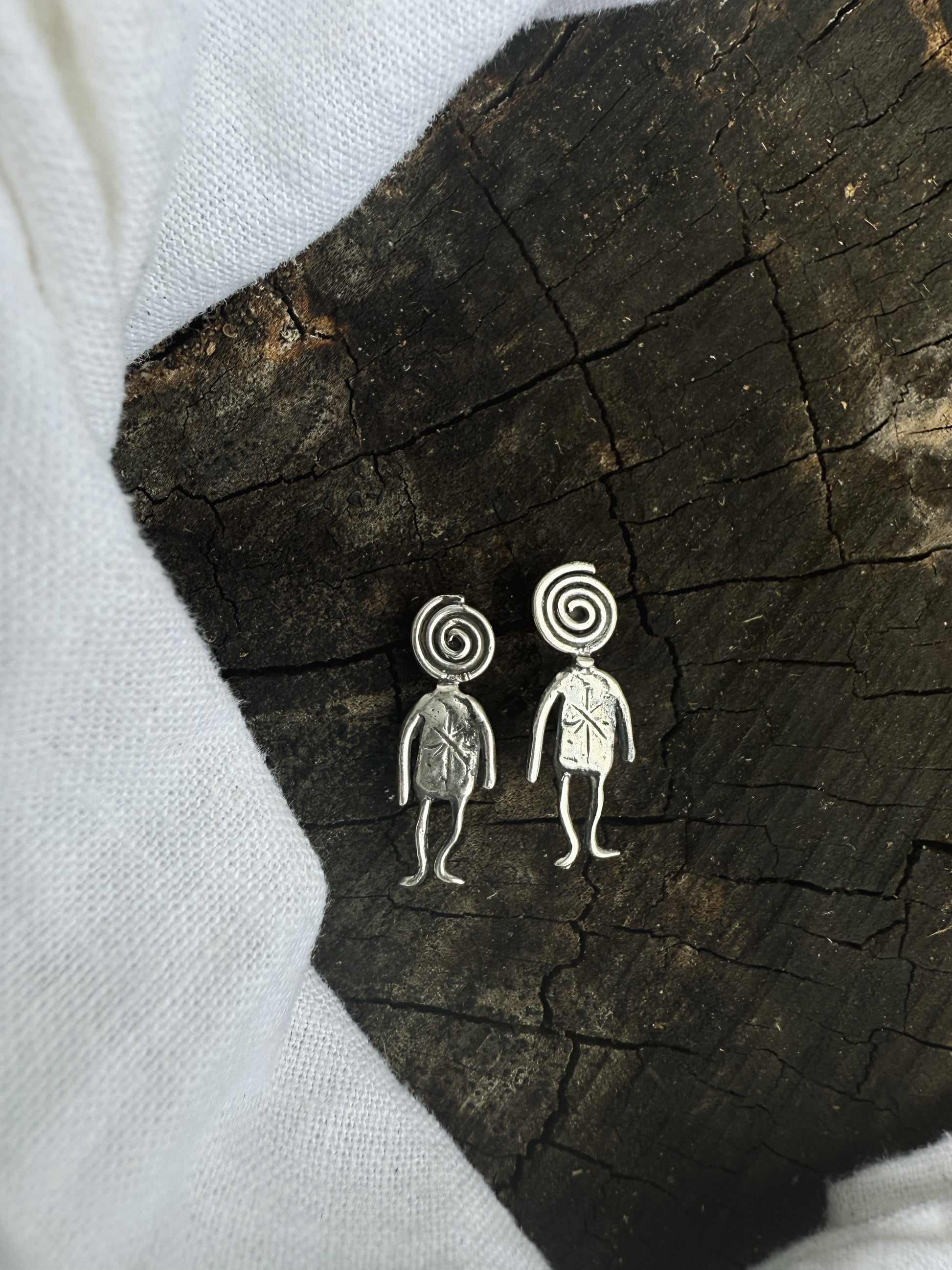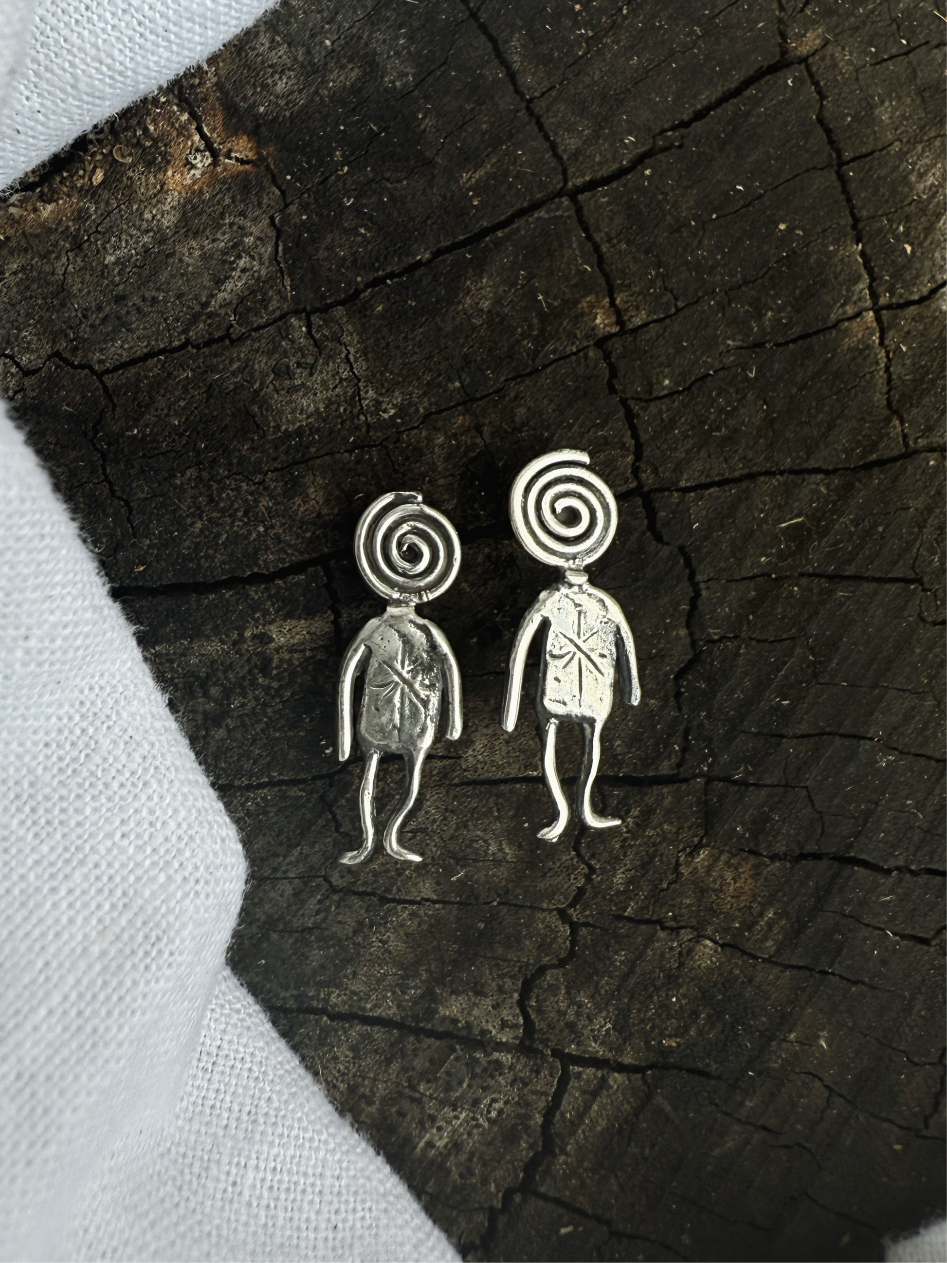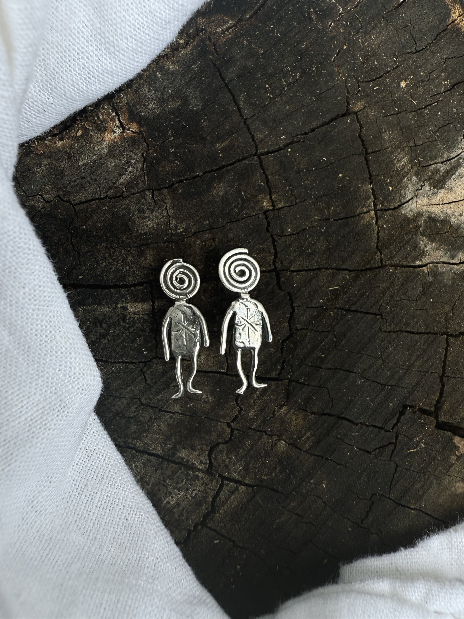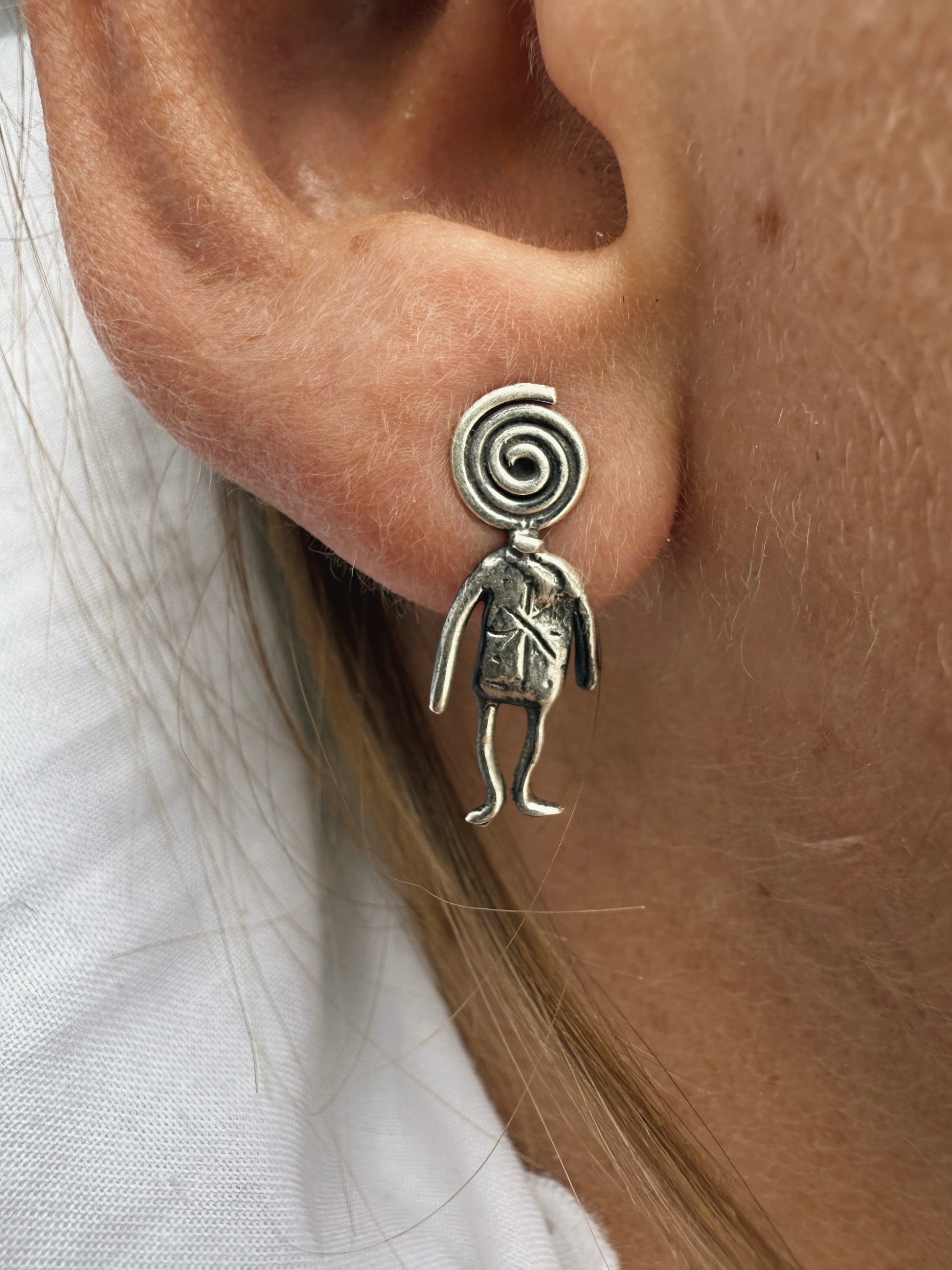 With a swirling spiral for a head, he embodies the beauty of getting lost in thought, the dance between chaos and calm. Handcrafted in solid sterling silver, the Dizzy Man Studs are a playful ode to the creative mind forever spinning, forever inspired.