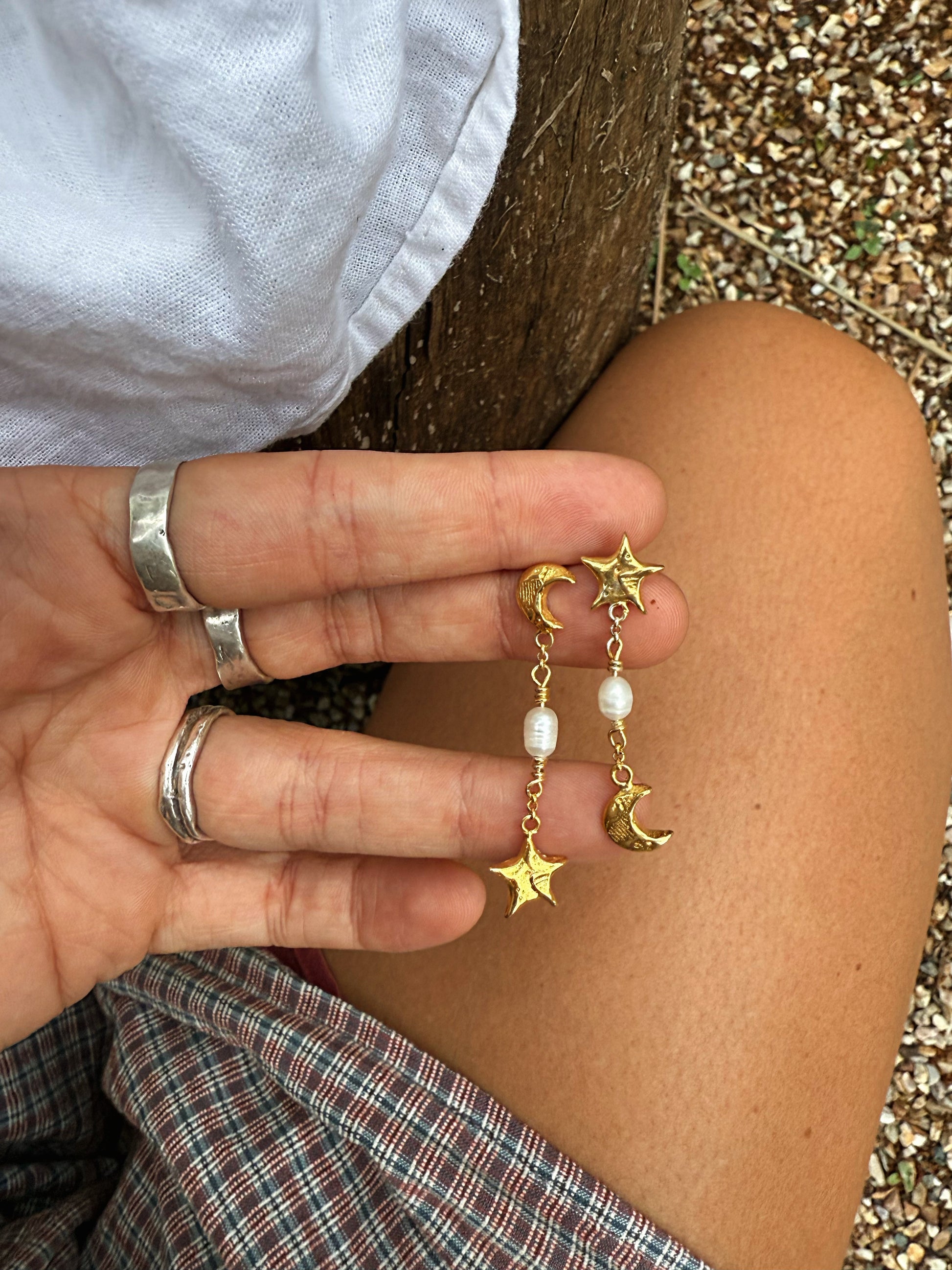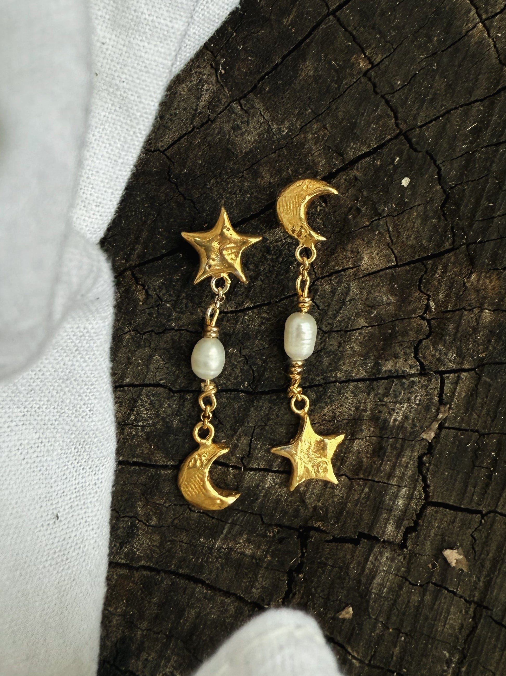 Each pair is slightly unique, handcrafted, and finished with a pearl, a quiet symbol of lunar wisdom. Mindfully made with love.