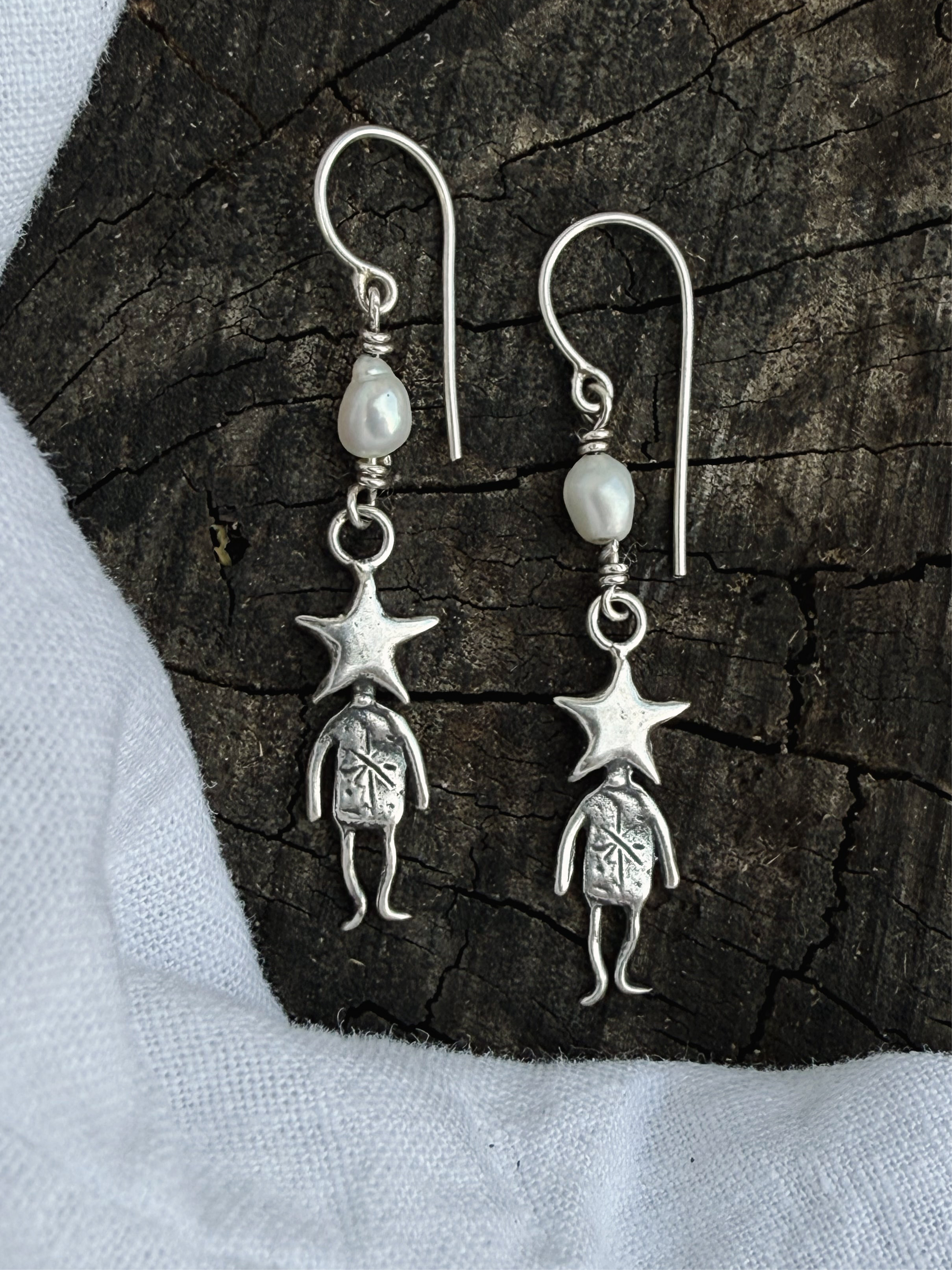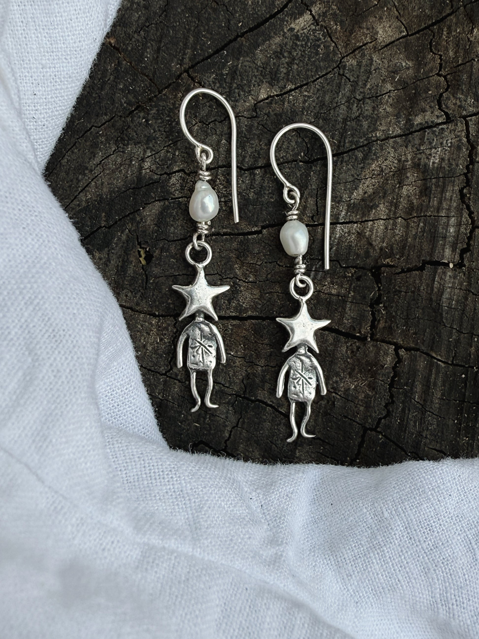 Meet the Star Man Pearl Earrings, with a floating pearl above him, like a tiny star caught in the cosmos. These earrings are storytellers, reminding us that we’re all woven from stardust and magic.