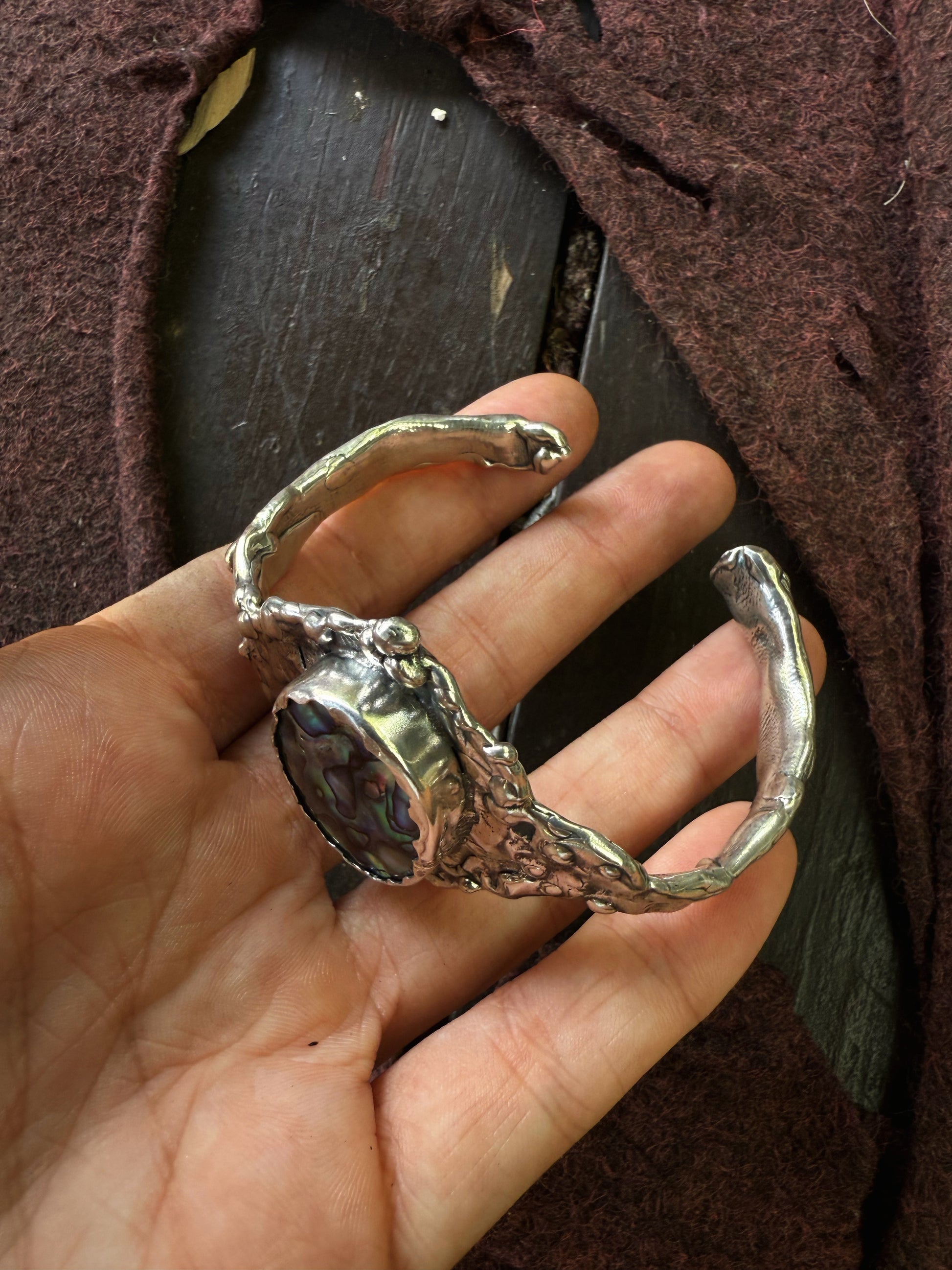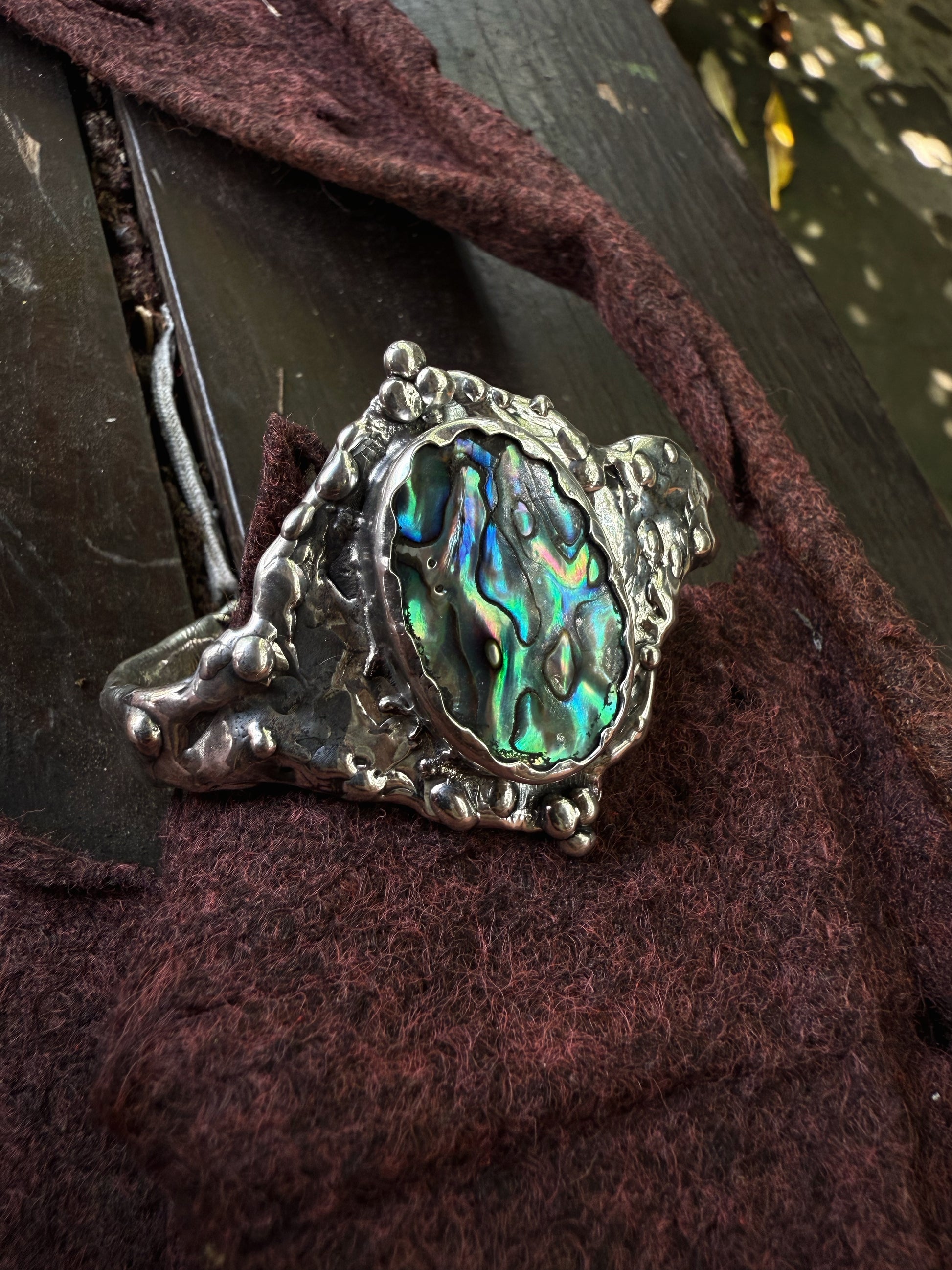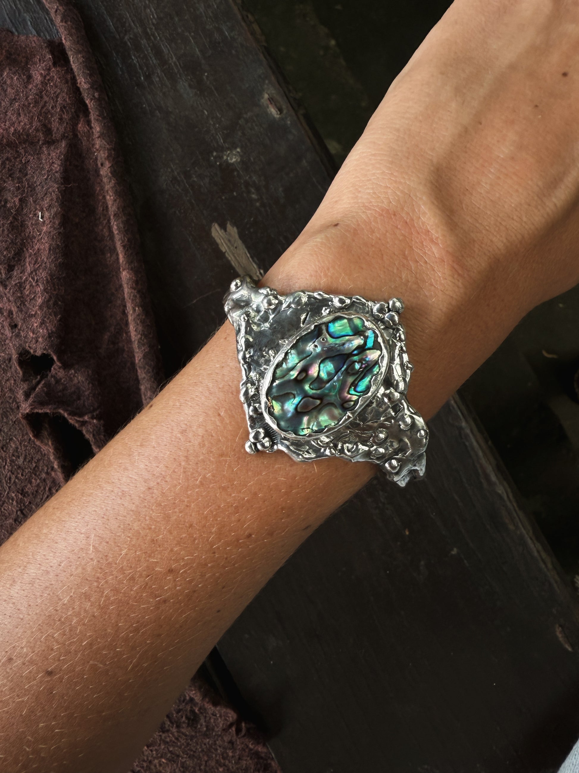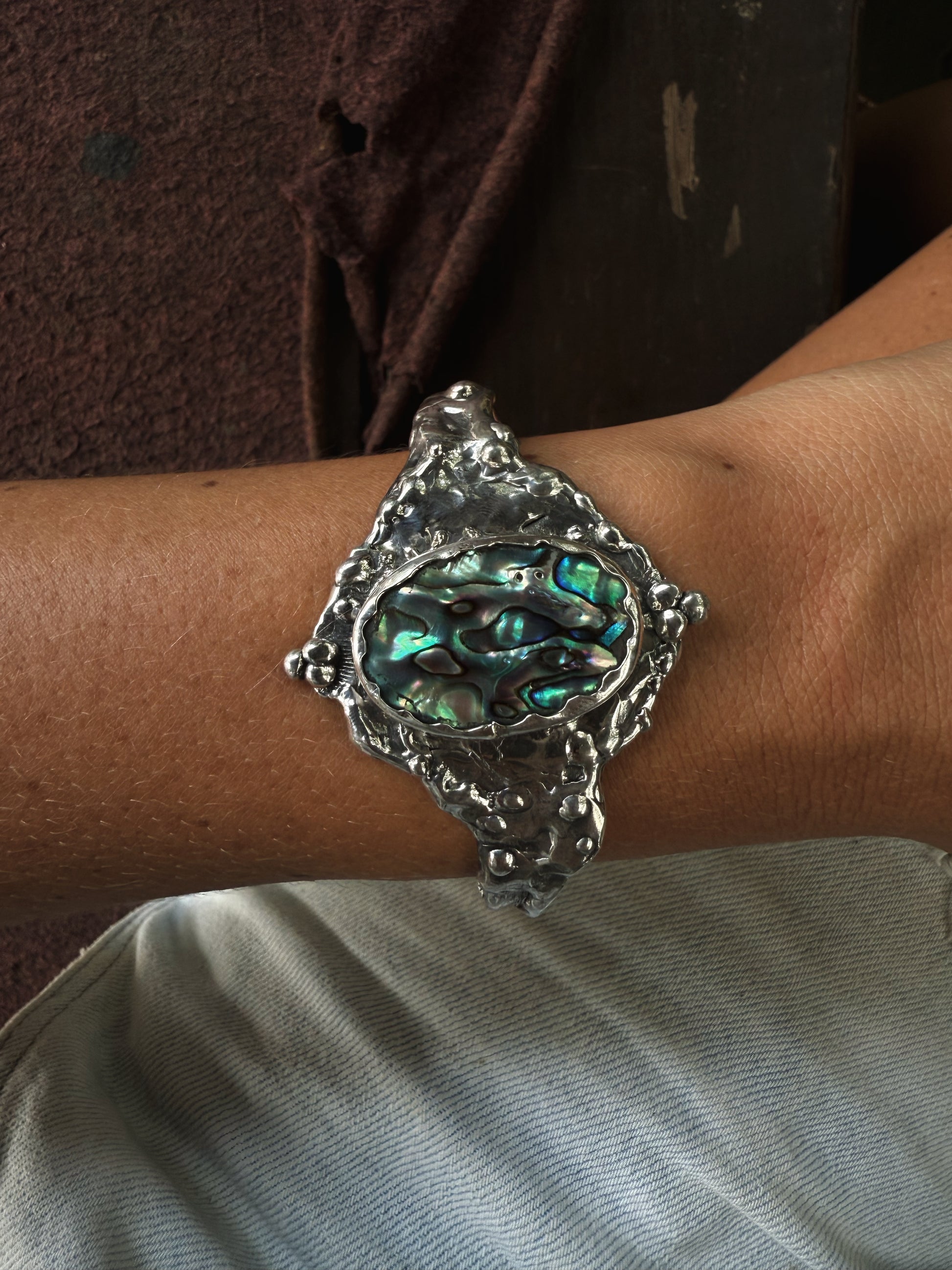 This organic, chunky wrist cuff feels like a return to the depths of an oceanic heaven, a pool of healing water and a portal into a world where nature’s medicine exists and is recognised as art. A highest-quality paua shell sits at its center, alive with deep blues and greens and mesmerising, eye-catching patterns. It’s nestled within the embrace of organically textured silver, drawing the eye as if the whispers of the ocean itself are calling you closer. One of my forever favourites and a creation I’ll always hold close to my heart.