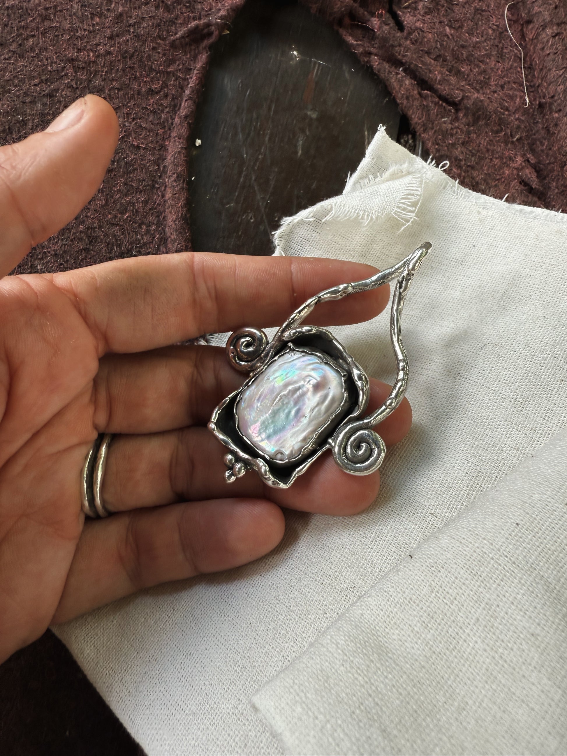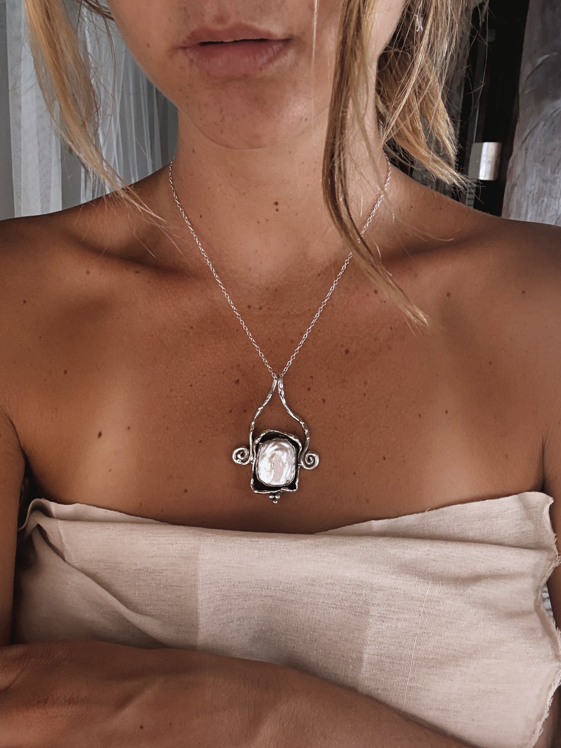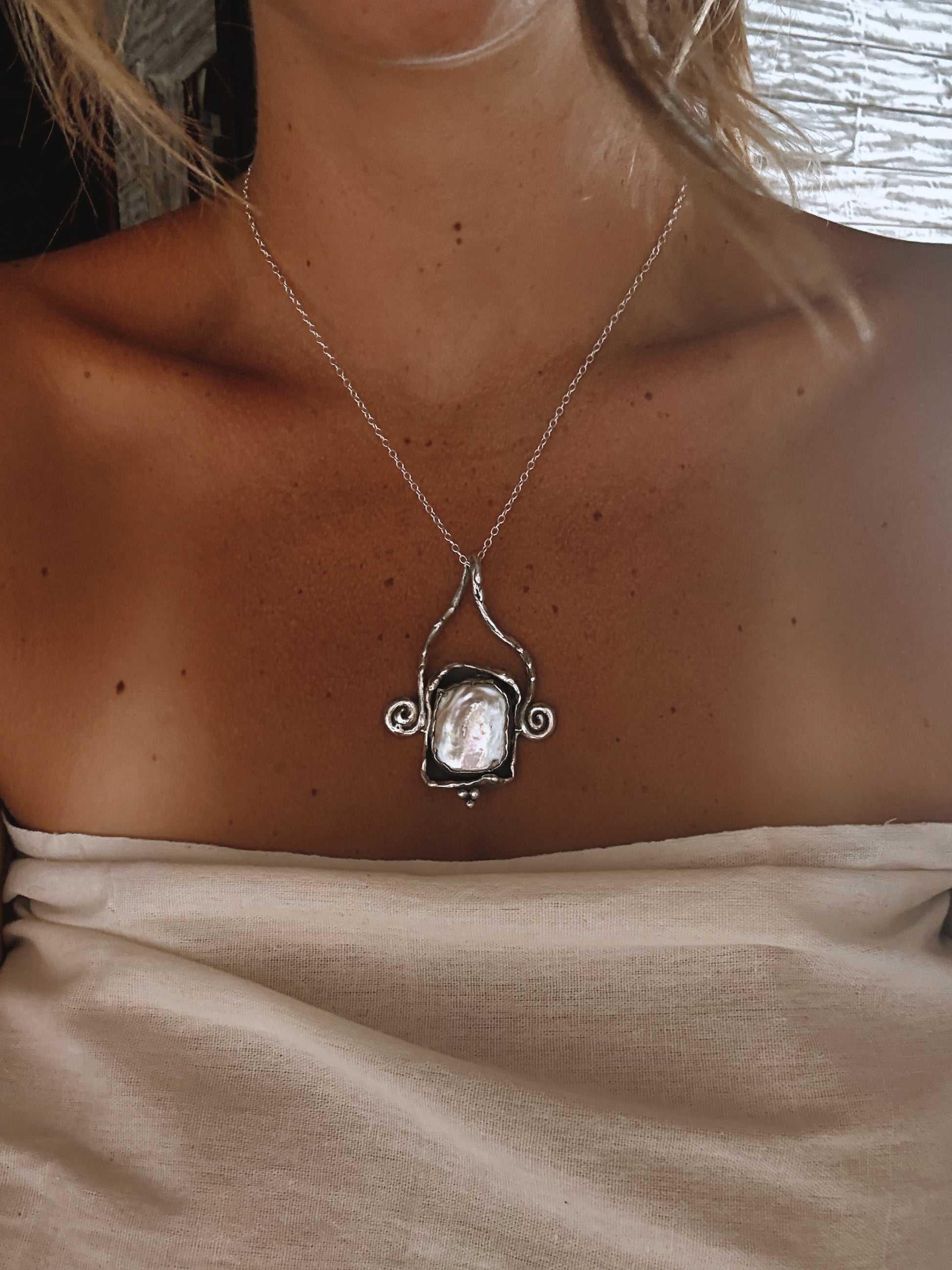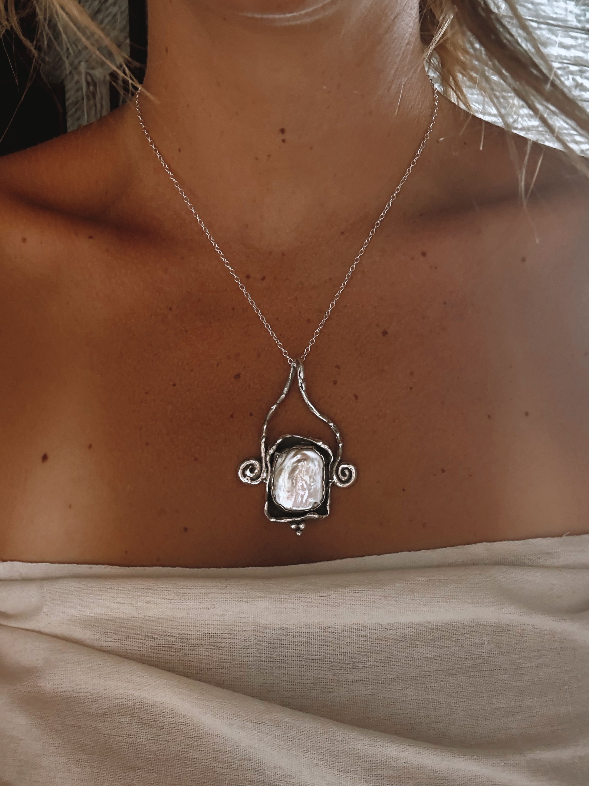 This ethereal, chunky yet elegant pearl necklace has my heart, a tribute to the purity we carry within and the quiet innocence that lives in us all, rooted deeply in love. Handcrafted from solid sterling silver, a high-quality statement pearl rests beneath sculpted silver with an organic, flowing form. Spirals on either side symbolise growth and continuous becoming, a gentle reminder of life’s unfolding journey and the beauty of evolving into ourselves.