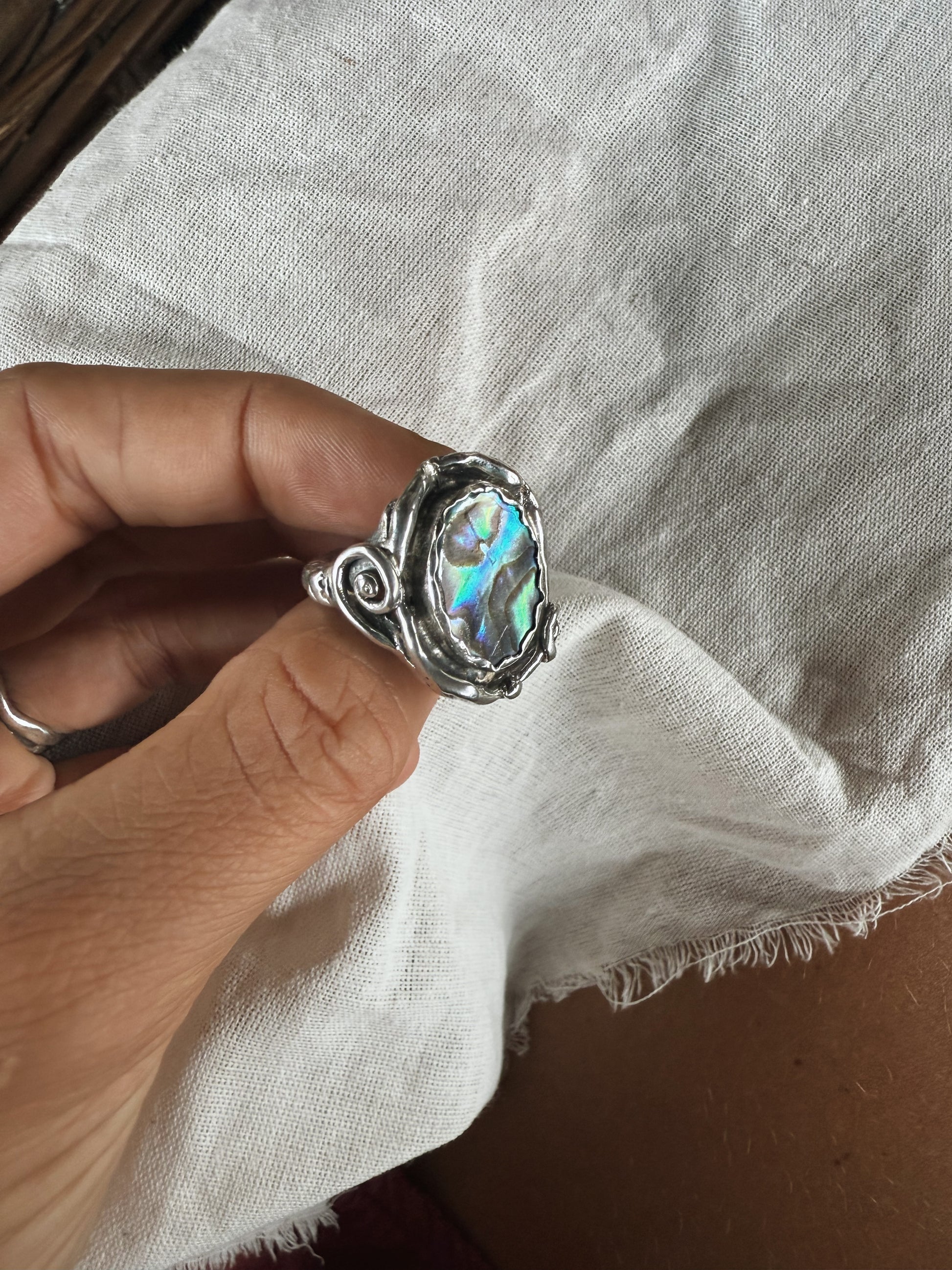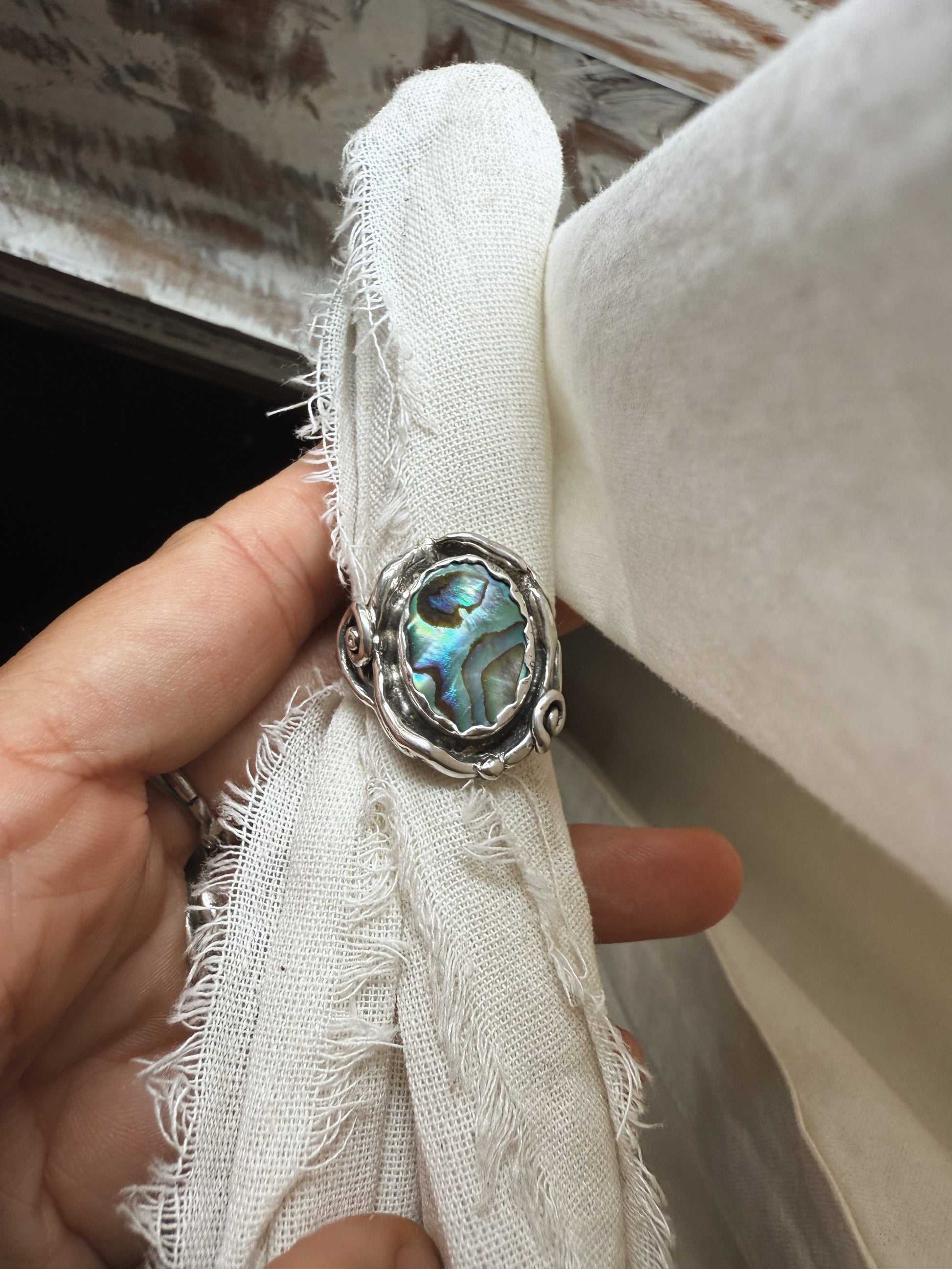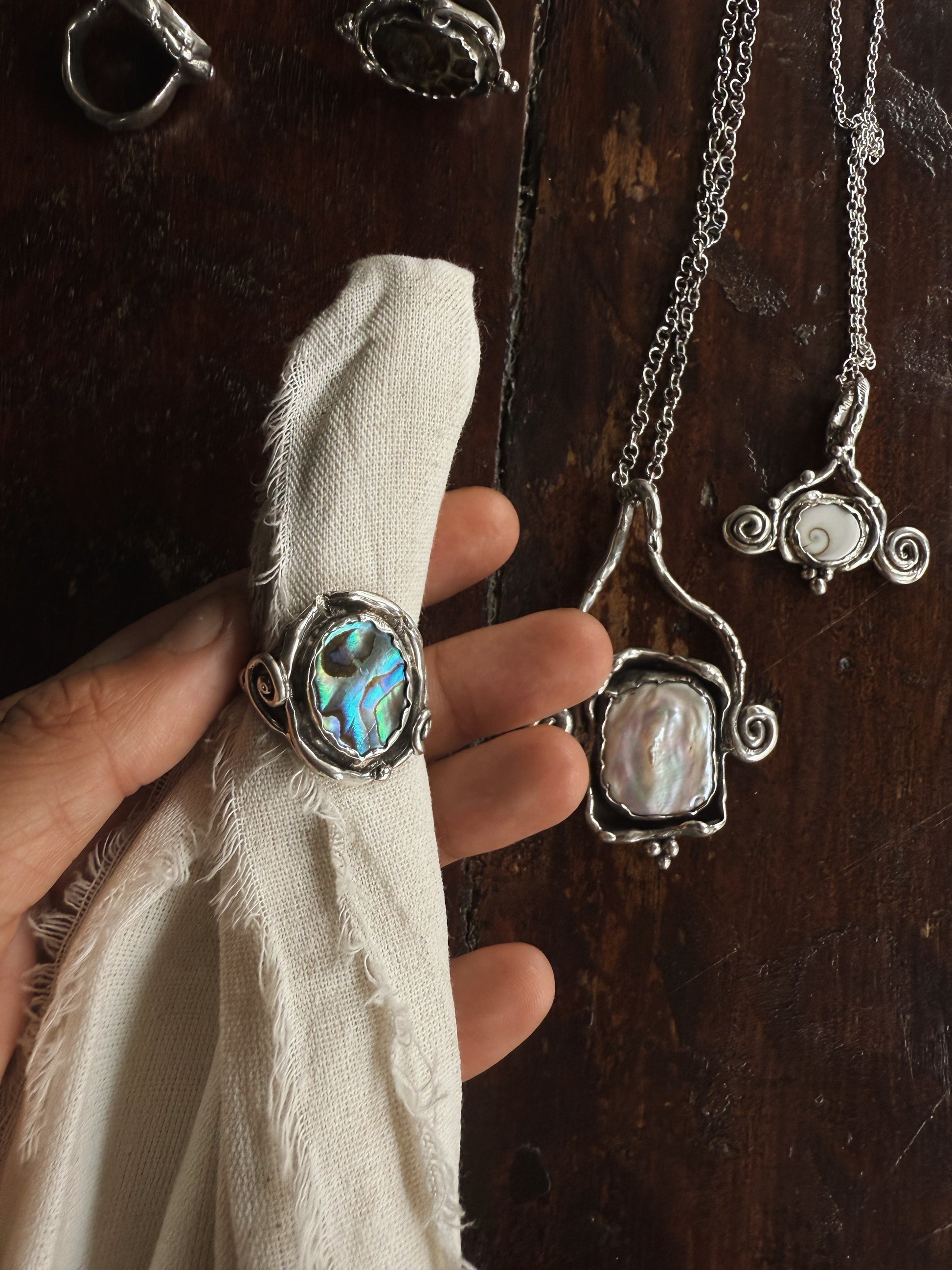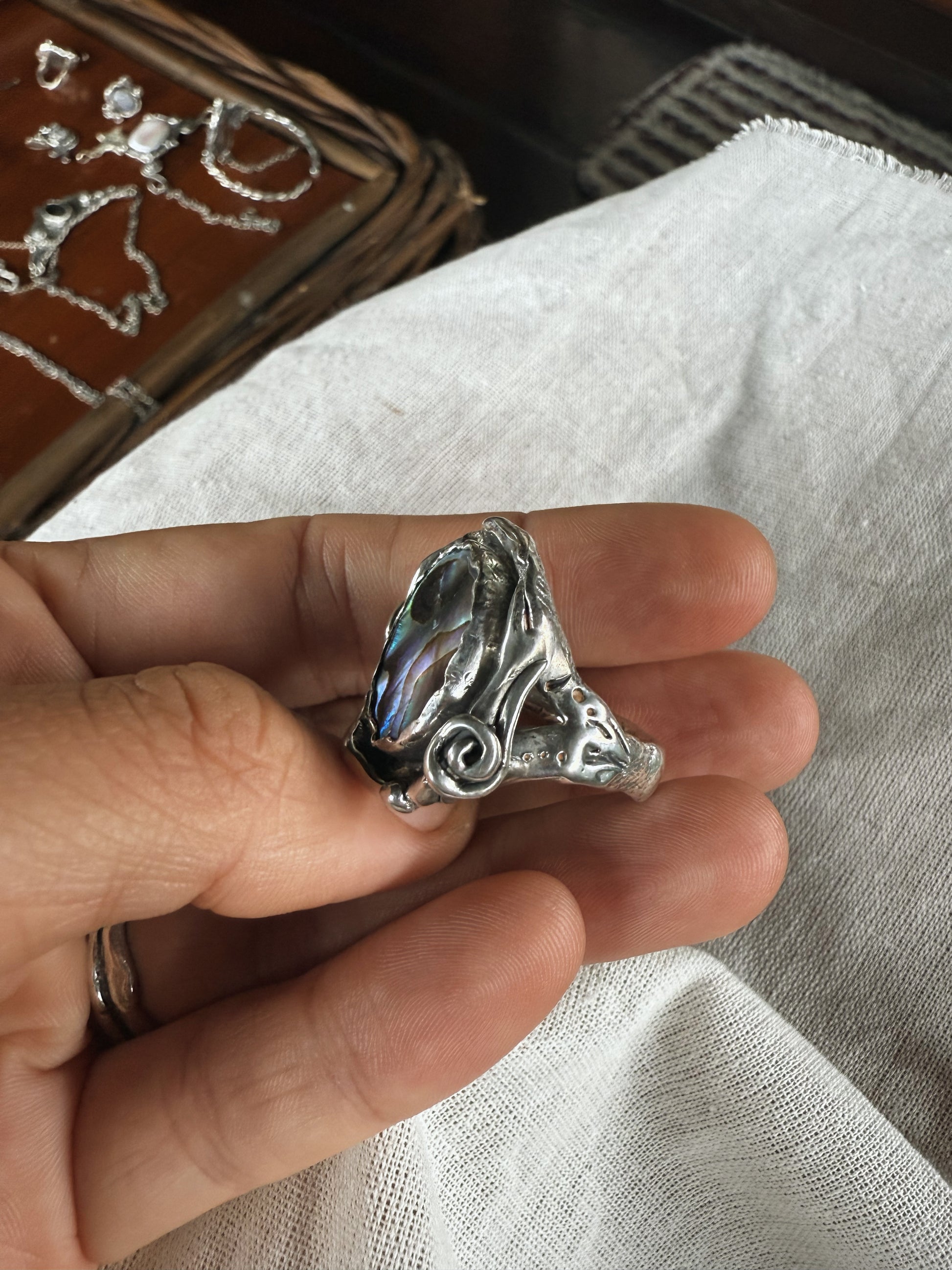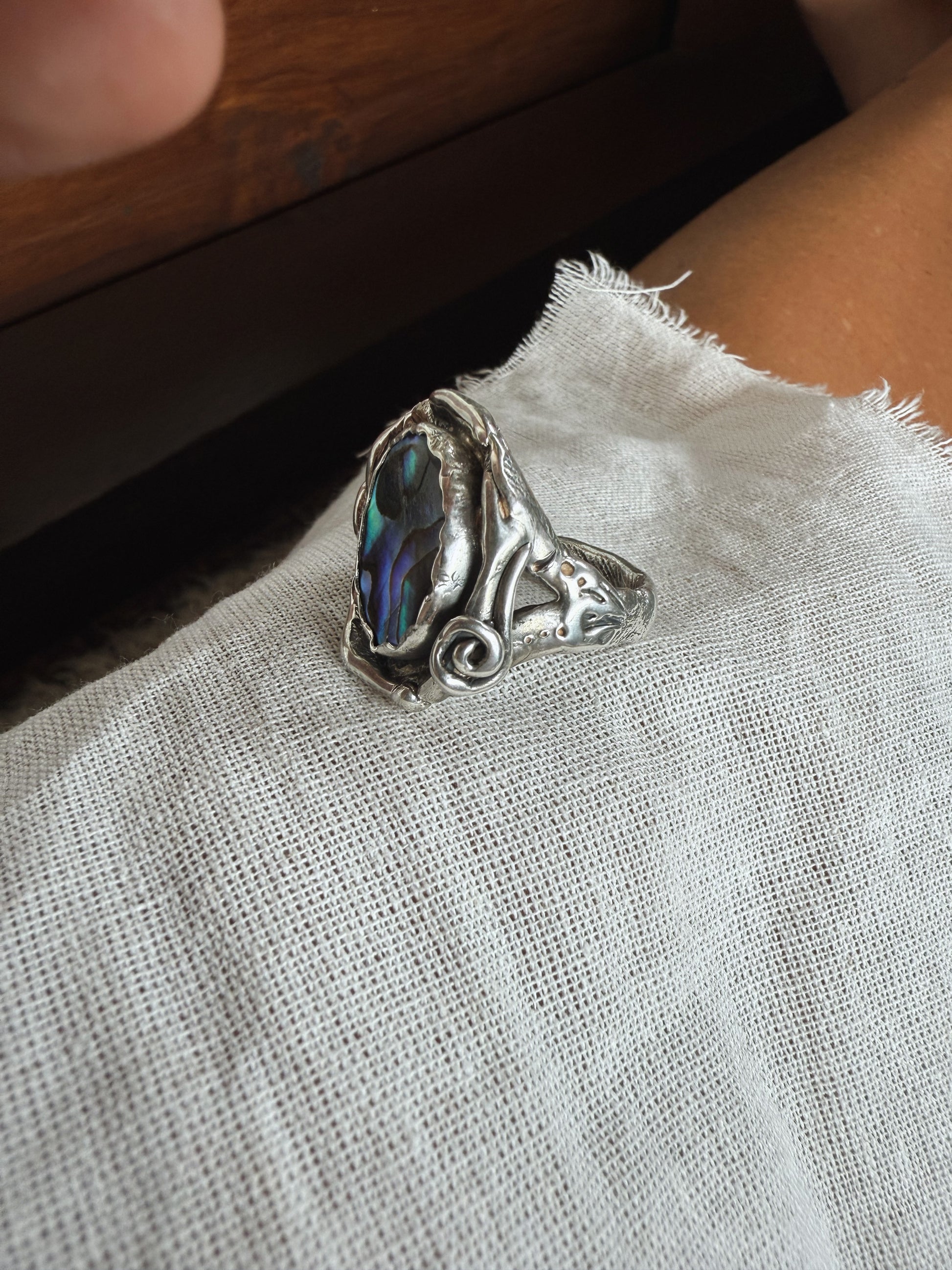 At the centre of this majestic ring, is an iridescent abalone shell catching the light like a living fragment of the sea, set within a dense, textured band that is etched with the stories and textures of the world and sea. It carries the sense of a small portal to the power of the present moment, drawing you back into your body and breath. The shell’s ocean light is a gentle reminder to return to the sea often to cleanse your human avatar and spirit, to release what’s heavy, and to begin again in clarity and flow.
