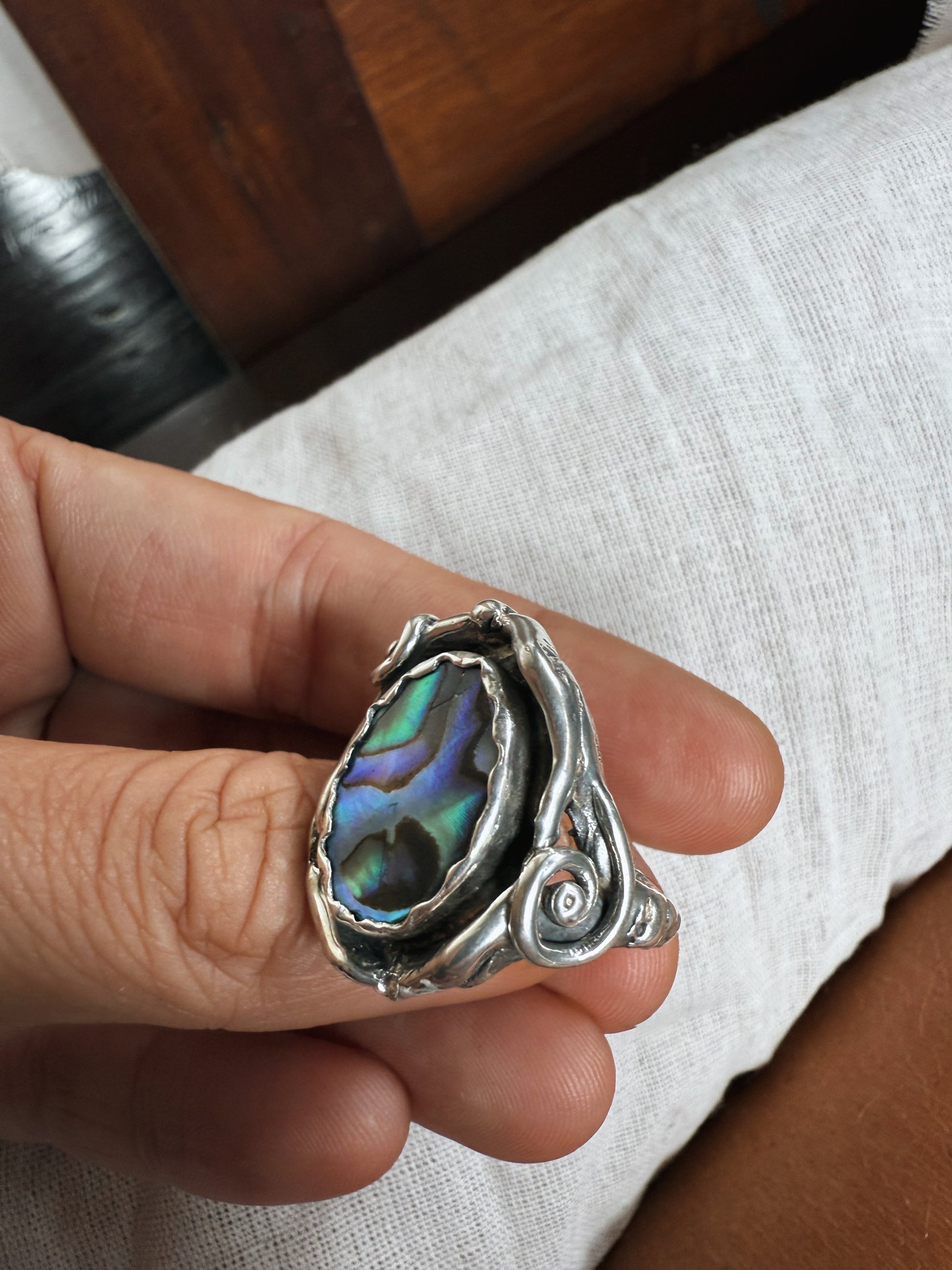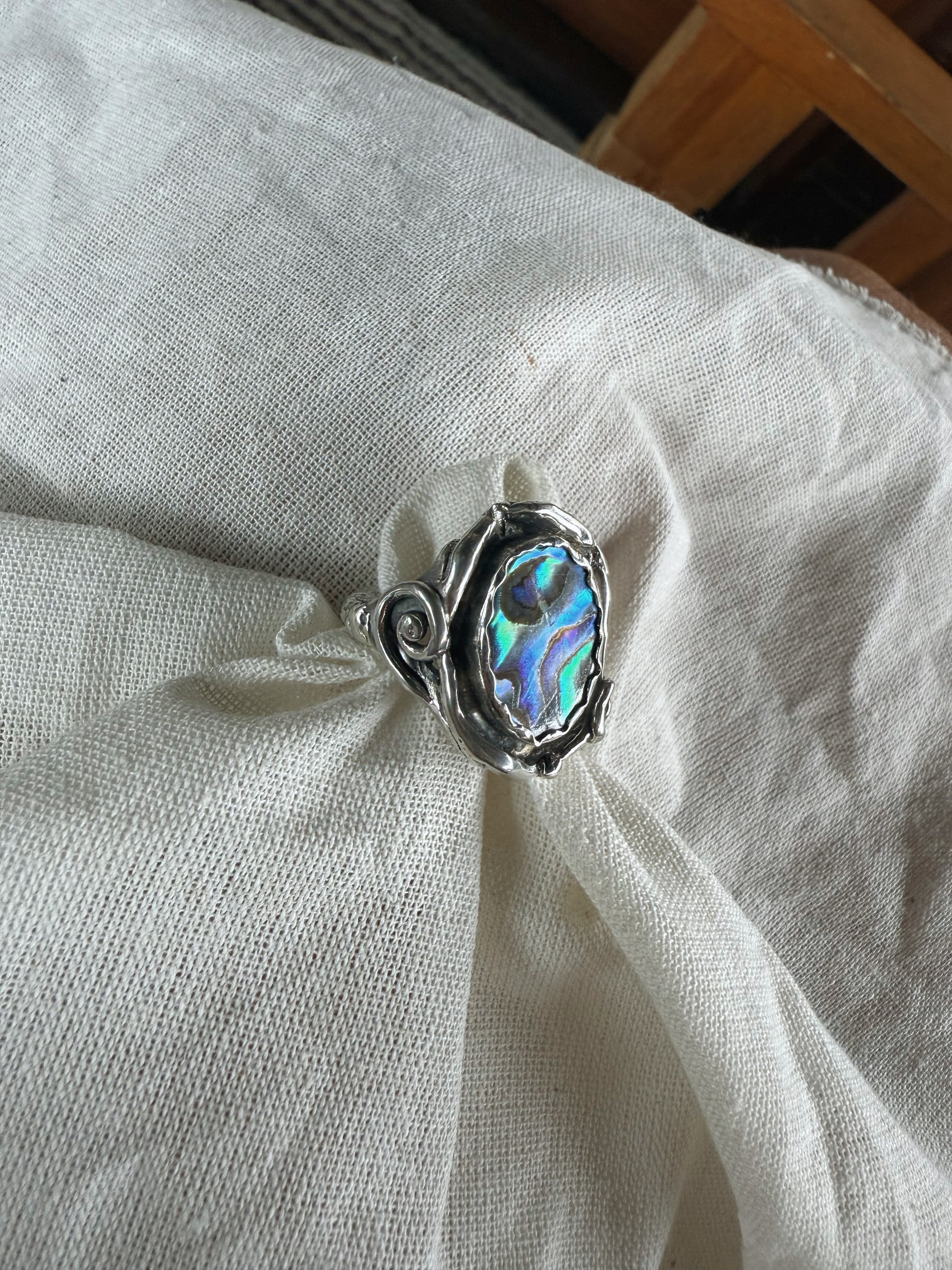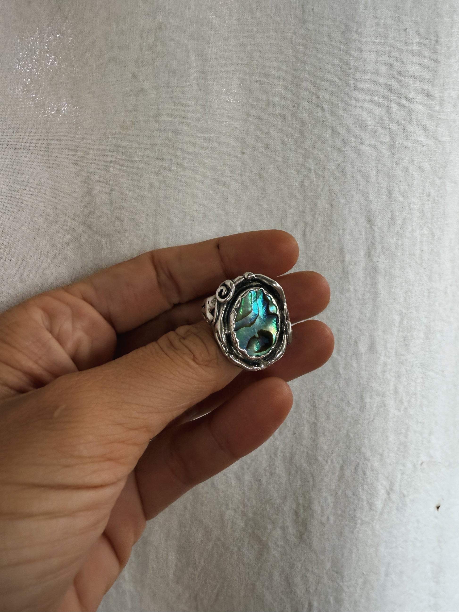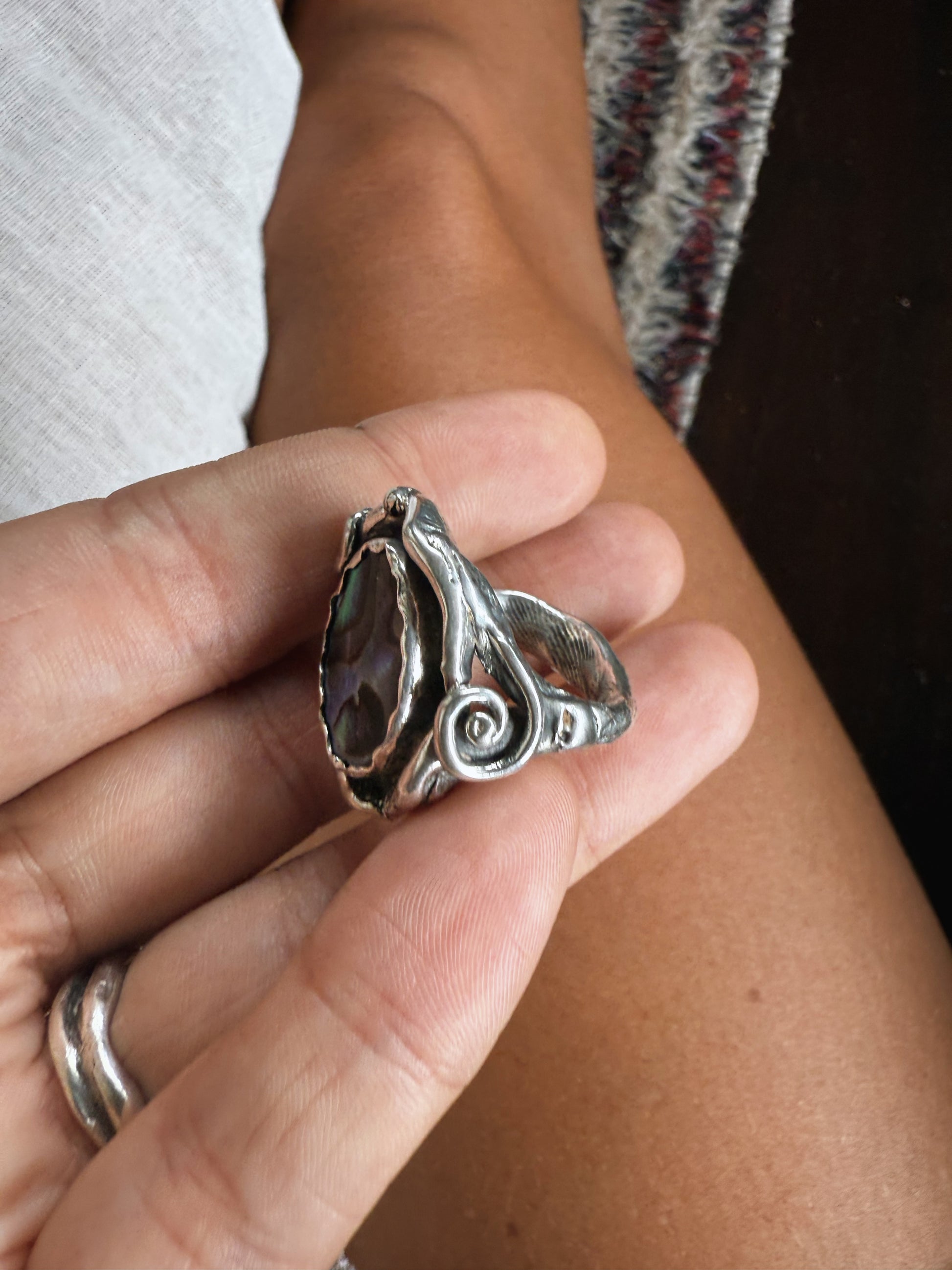 At the centre of this majestic ring, is an iridescent abalone shell catching the light like a living fragment of the sea, set within a dense, textured band that is etched with the stories and textures of the world and sea. It carries the sense of a small portal to the power of the present moment, drawing you back into your body and breath. The shell’s ocean light is a gentle reminder to return to the sea often to cleanse your human avatar and spirit, to release what’s heavy, and to begin again in clarity and flow.