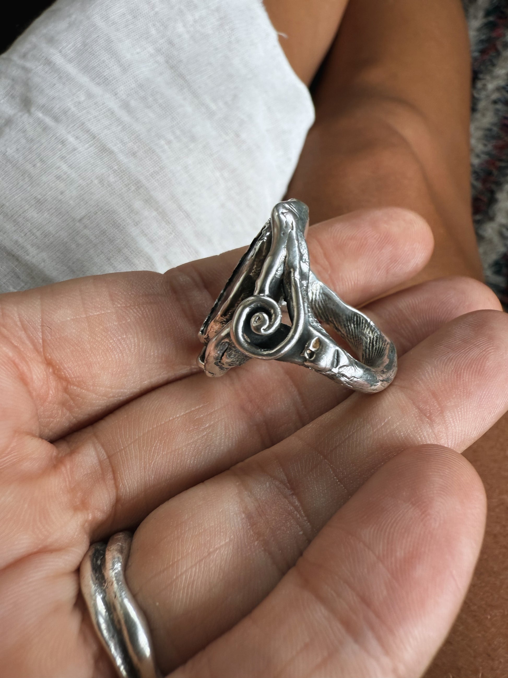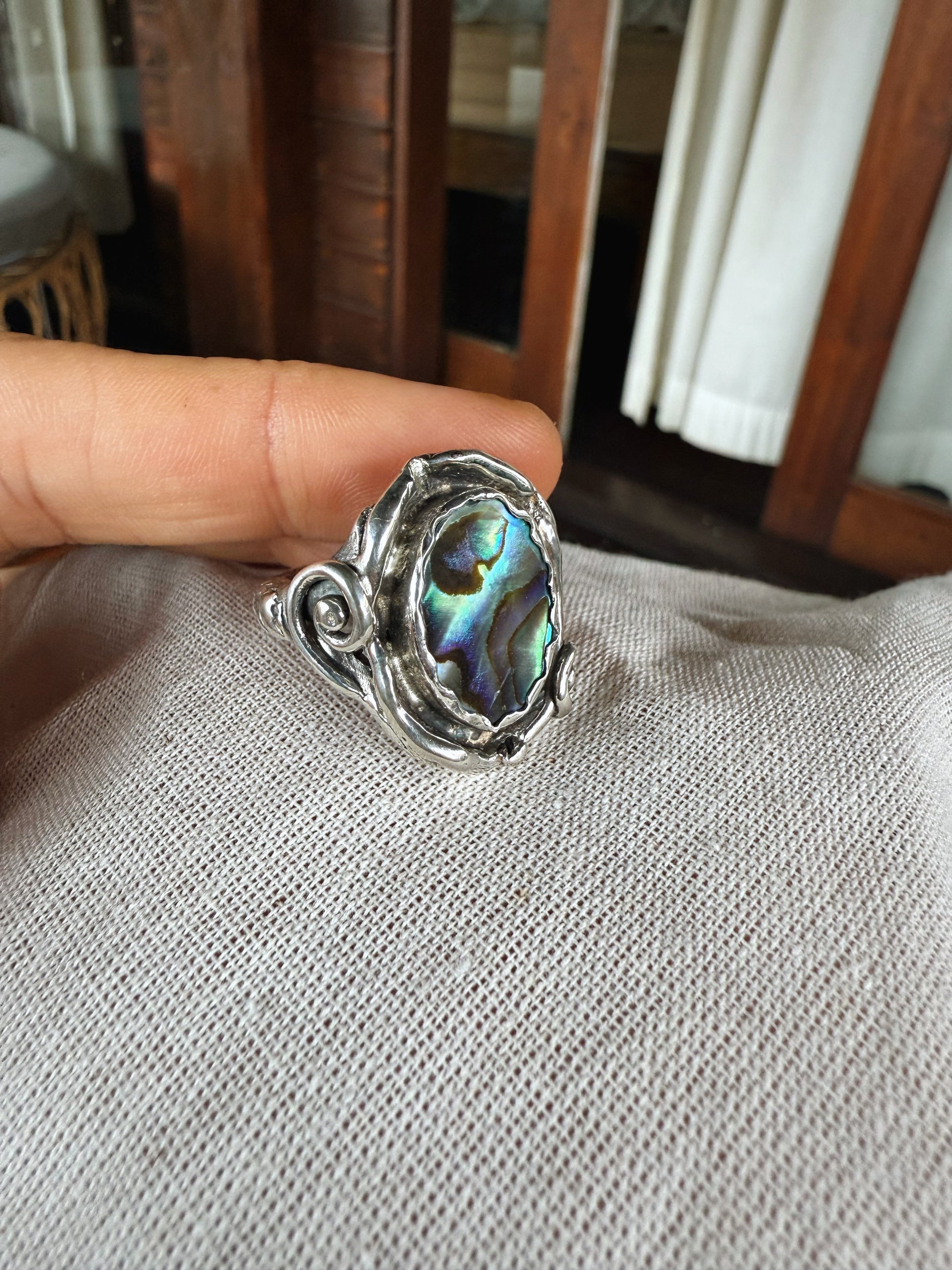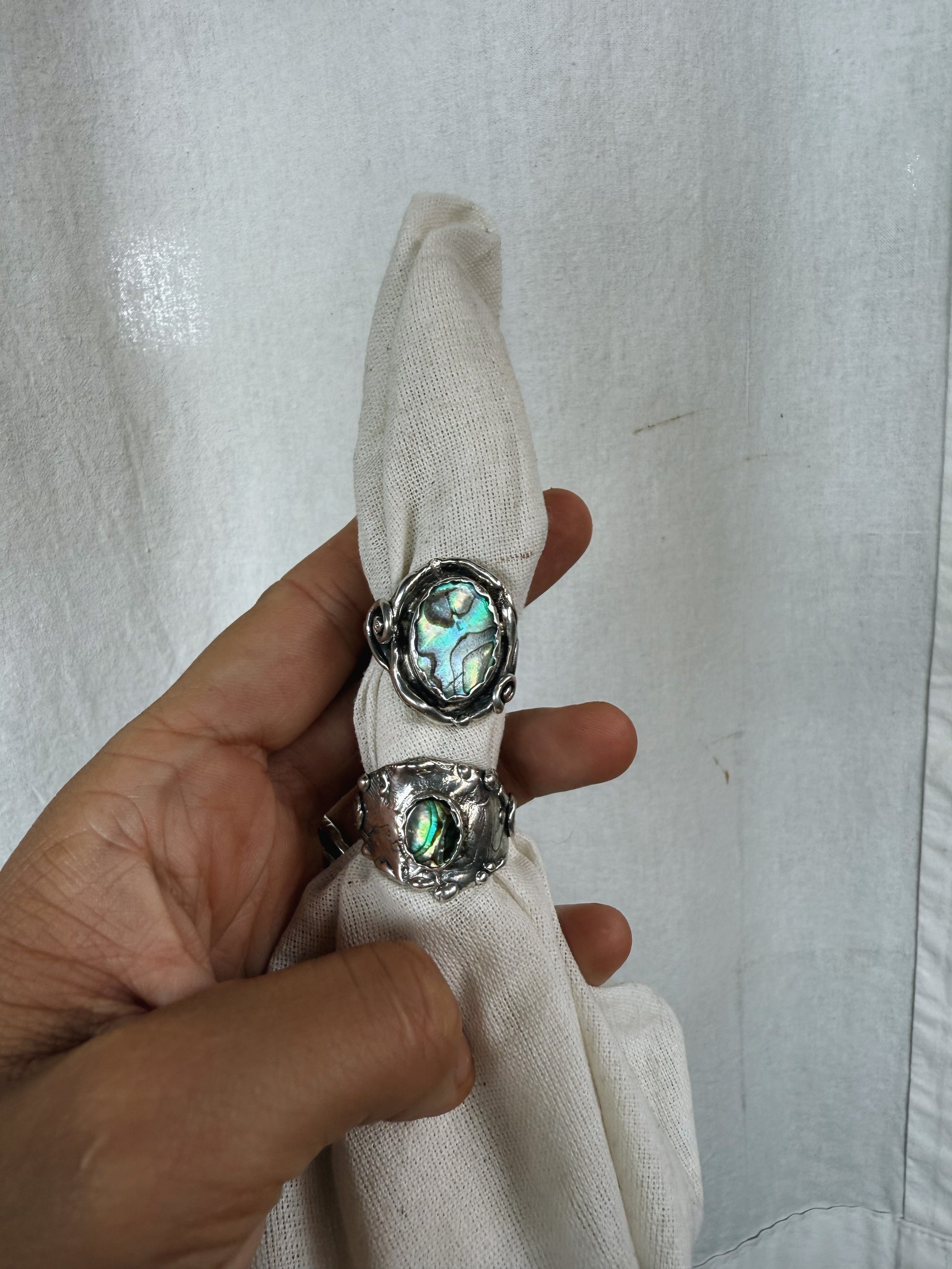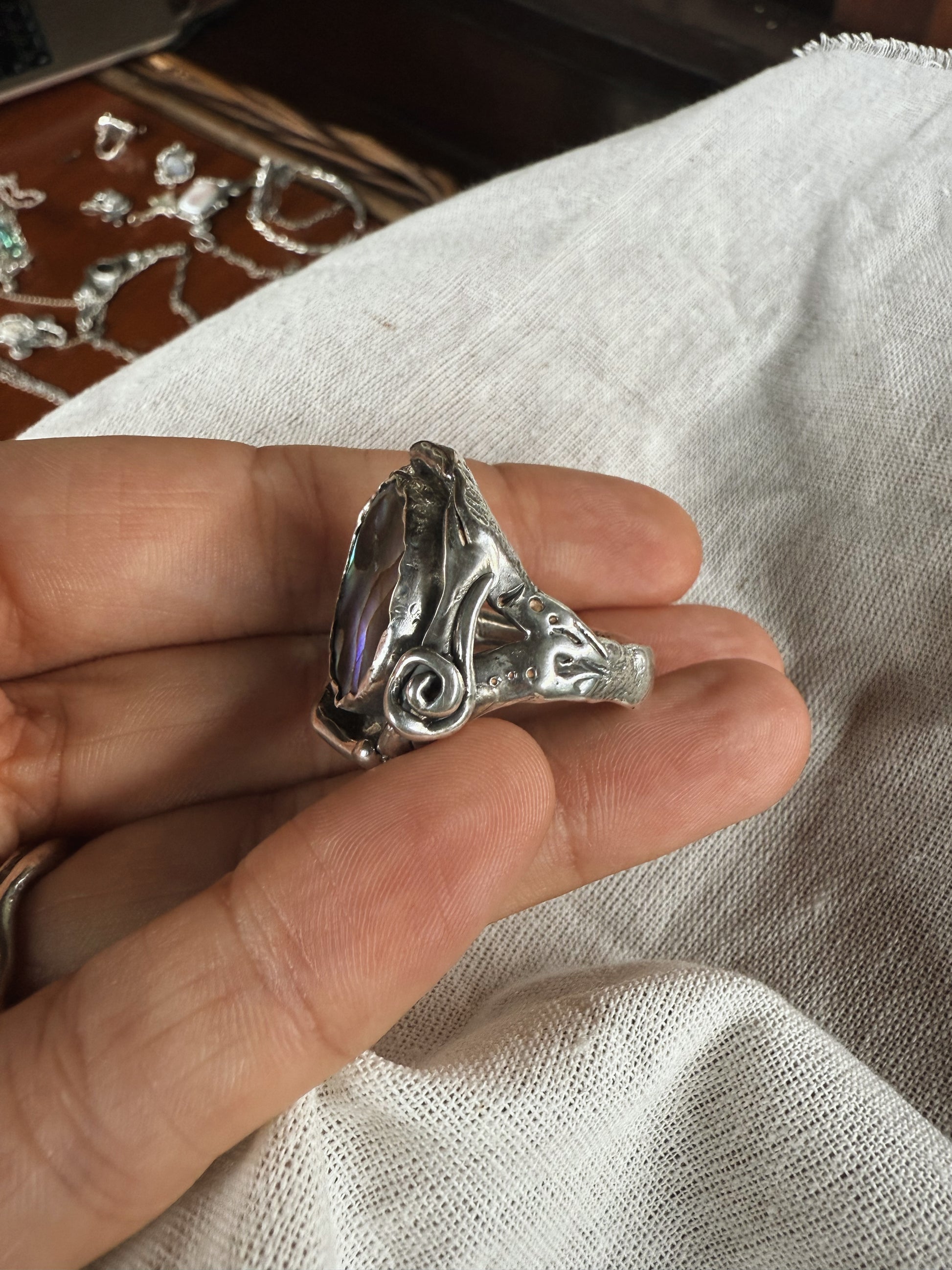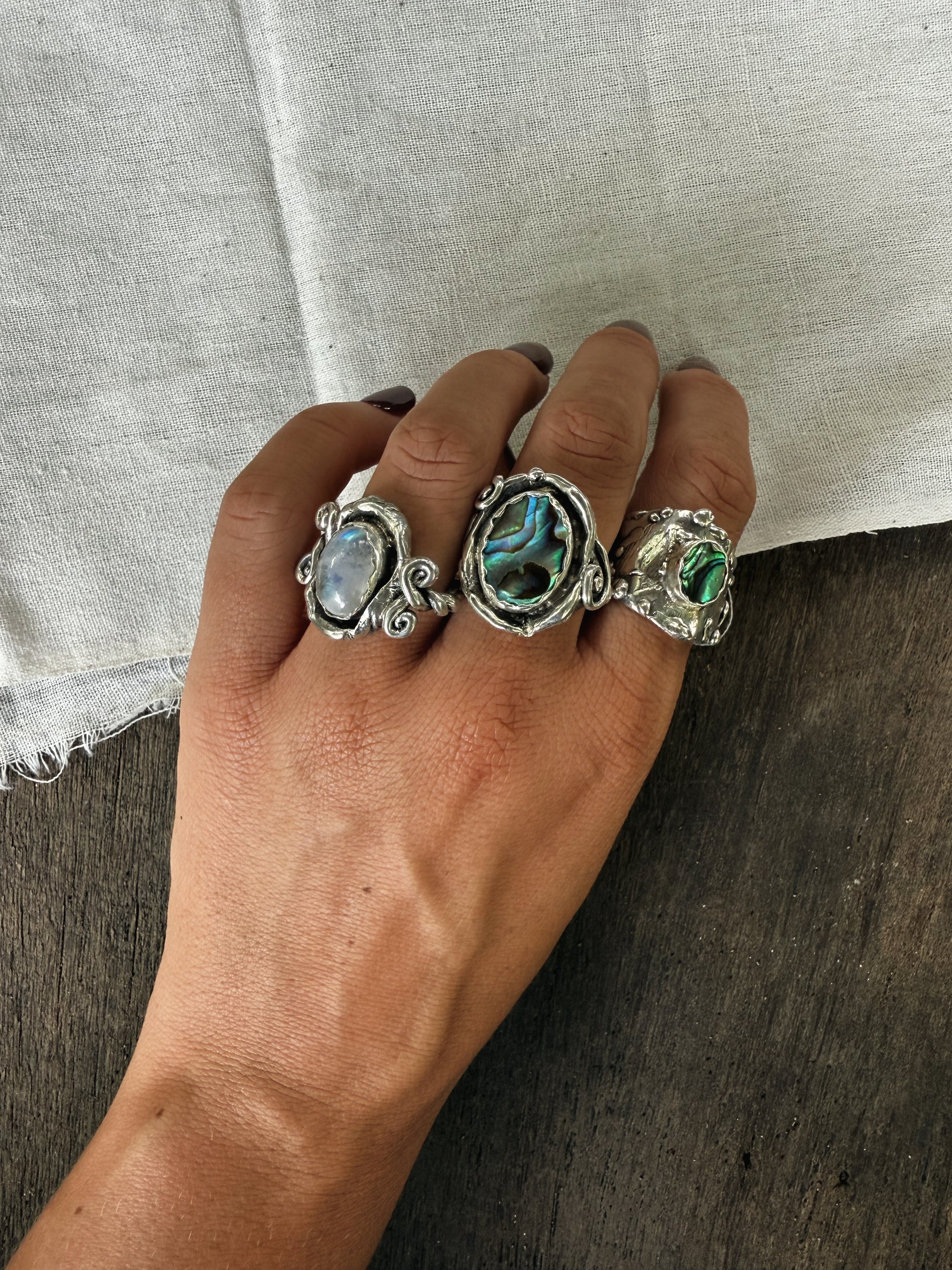 At the centre of this majestic ring, is an iridescent abalone shell catching the light like a living fragment of the sea, set within a dense, textured band that is etched with the stories and textures of the world and sea. It carries the sense of a small portal to the power of the present moment, drawing you back into your body and breath. The shell’s ocean light is a gentle reminder to return to the sea often to cleanse your human avatar and spirit, to release what’s heavy, and to begin again in clarity and flow.