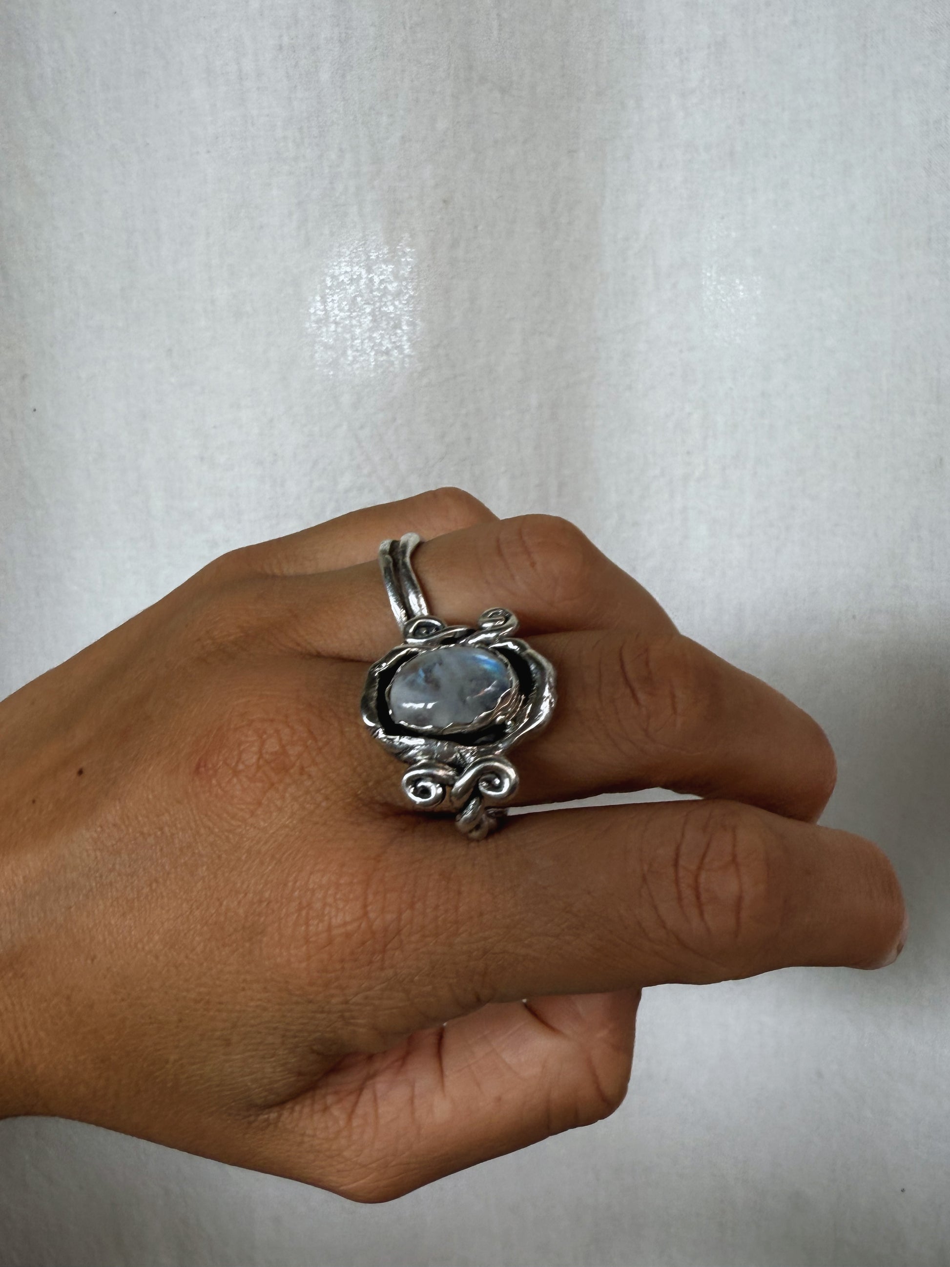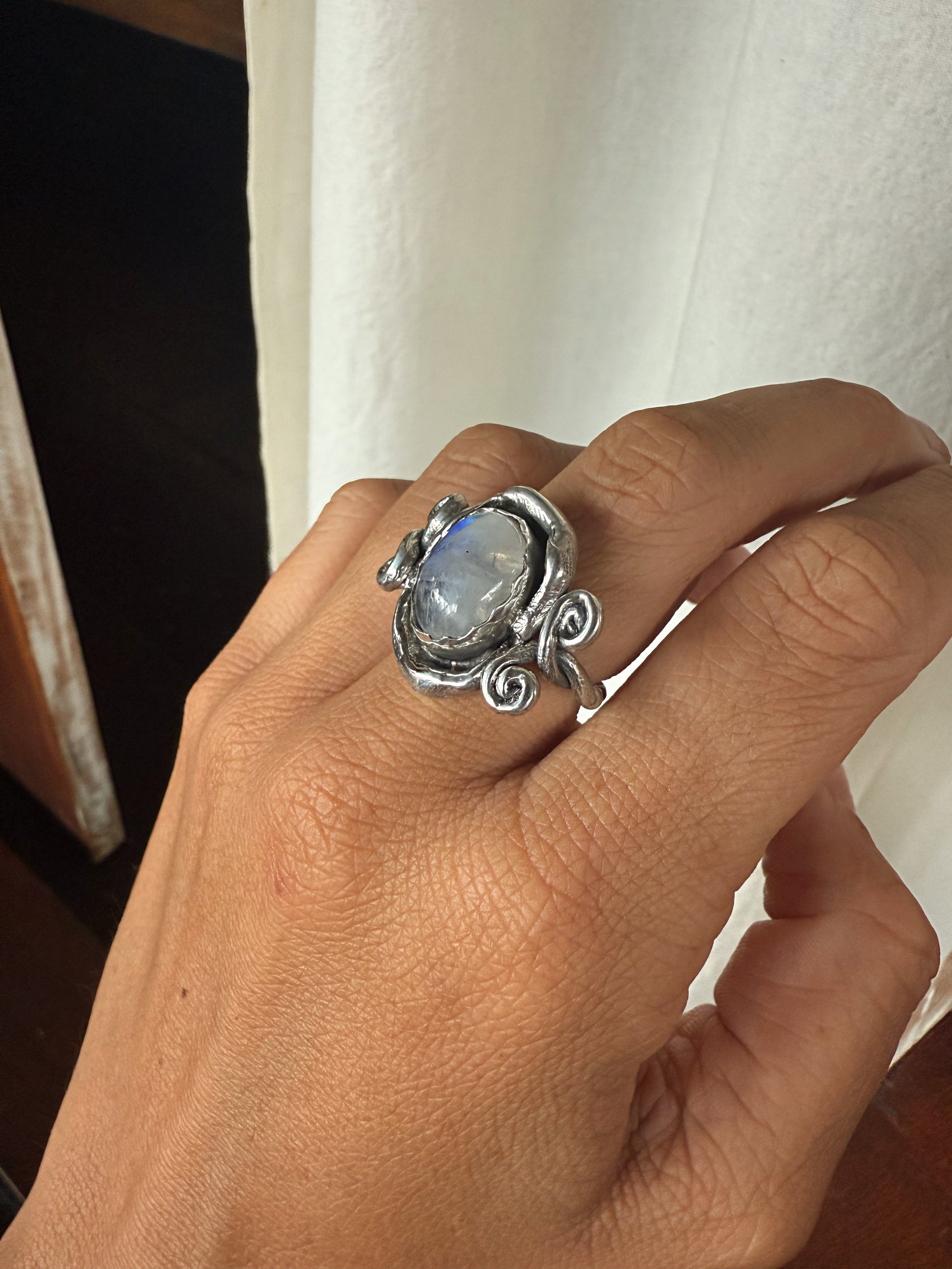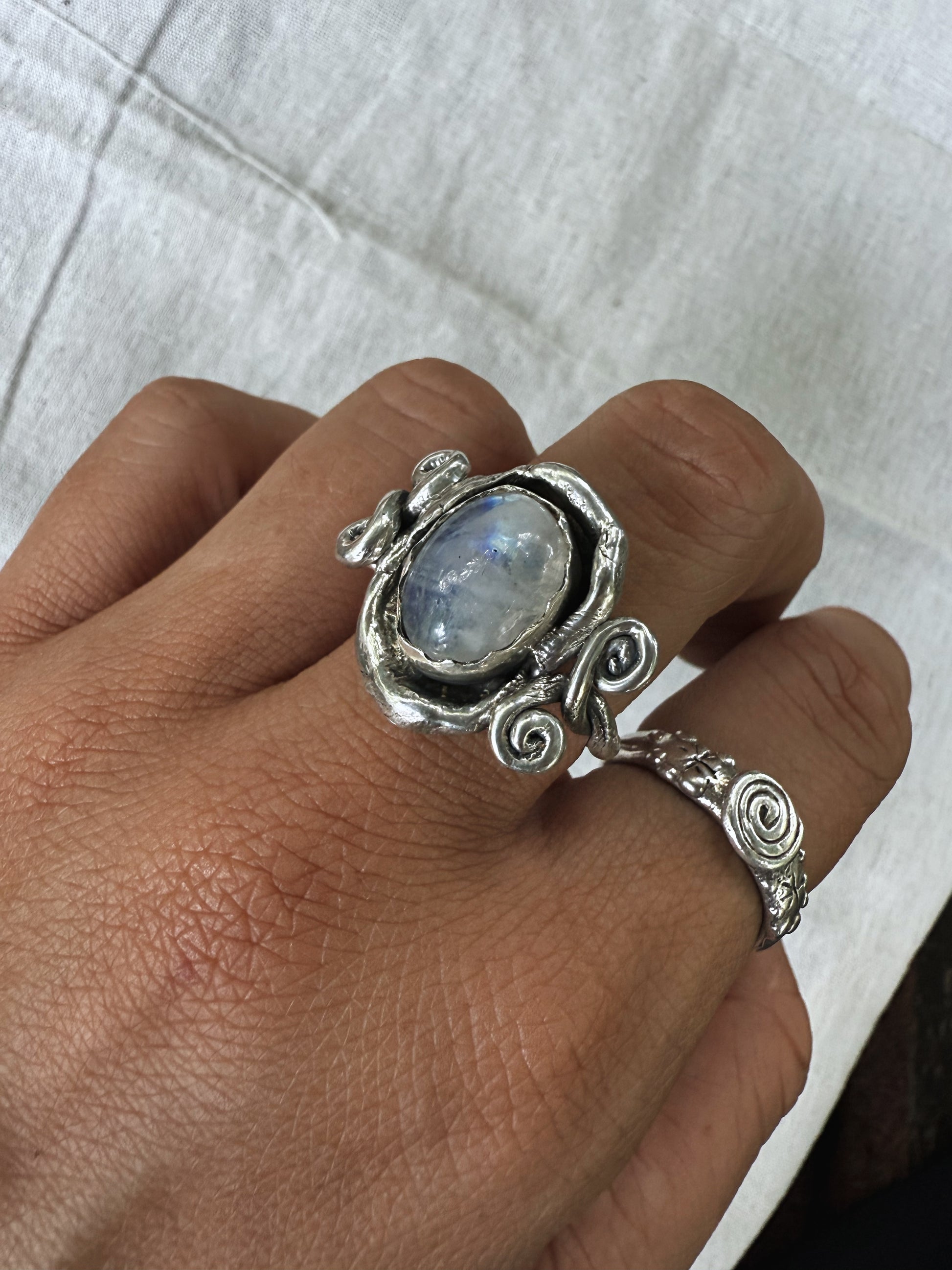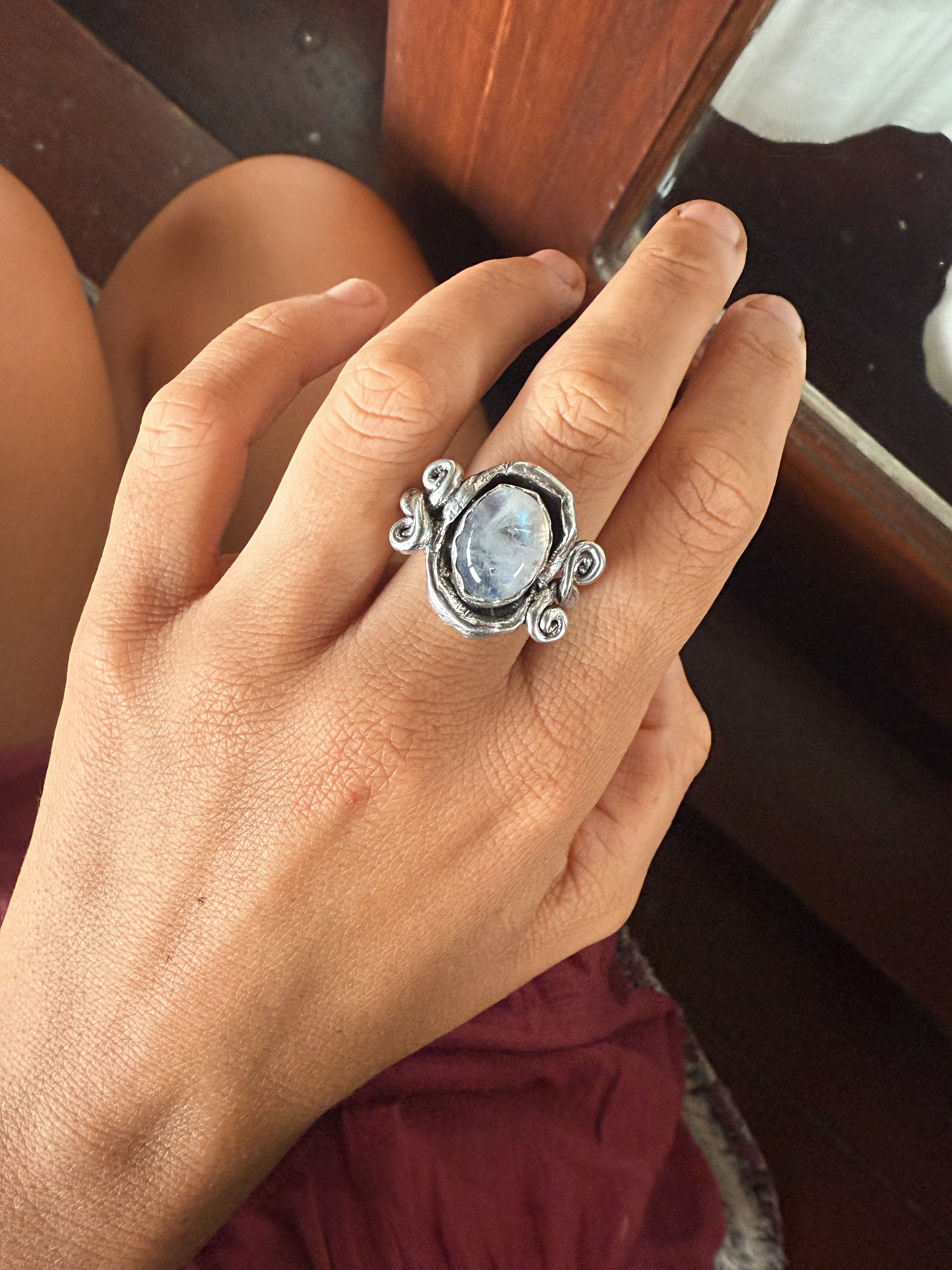 a chunky moonstone rests in a silver hug, like a small dream portal echoing the spinning pond itself, a place where water circles endlessly and hidden thoughts rise gently to the surface. It carries the quiet feeling that life is a dream we’re already inside of, if we let ourselves see it. Its shifting light and vibrant blue glow pull you inward, toward intuition, imagination, and that soft space where reality and dreaming melt into one.