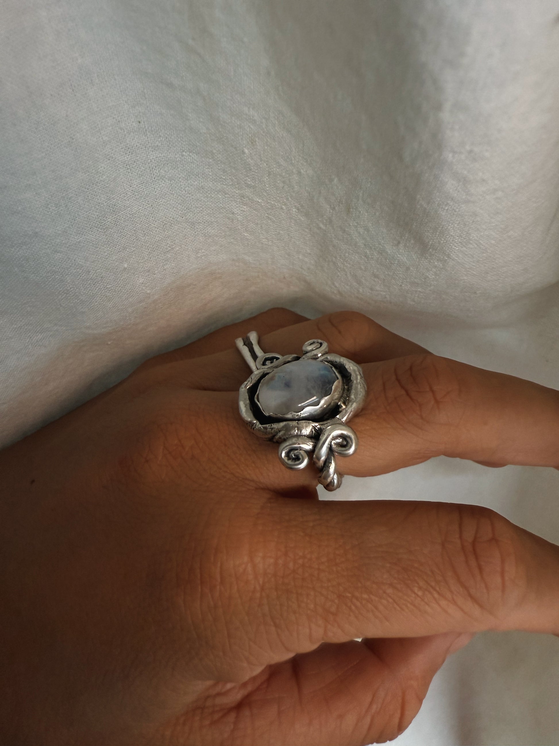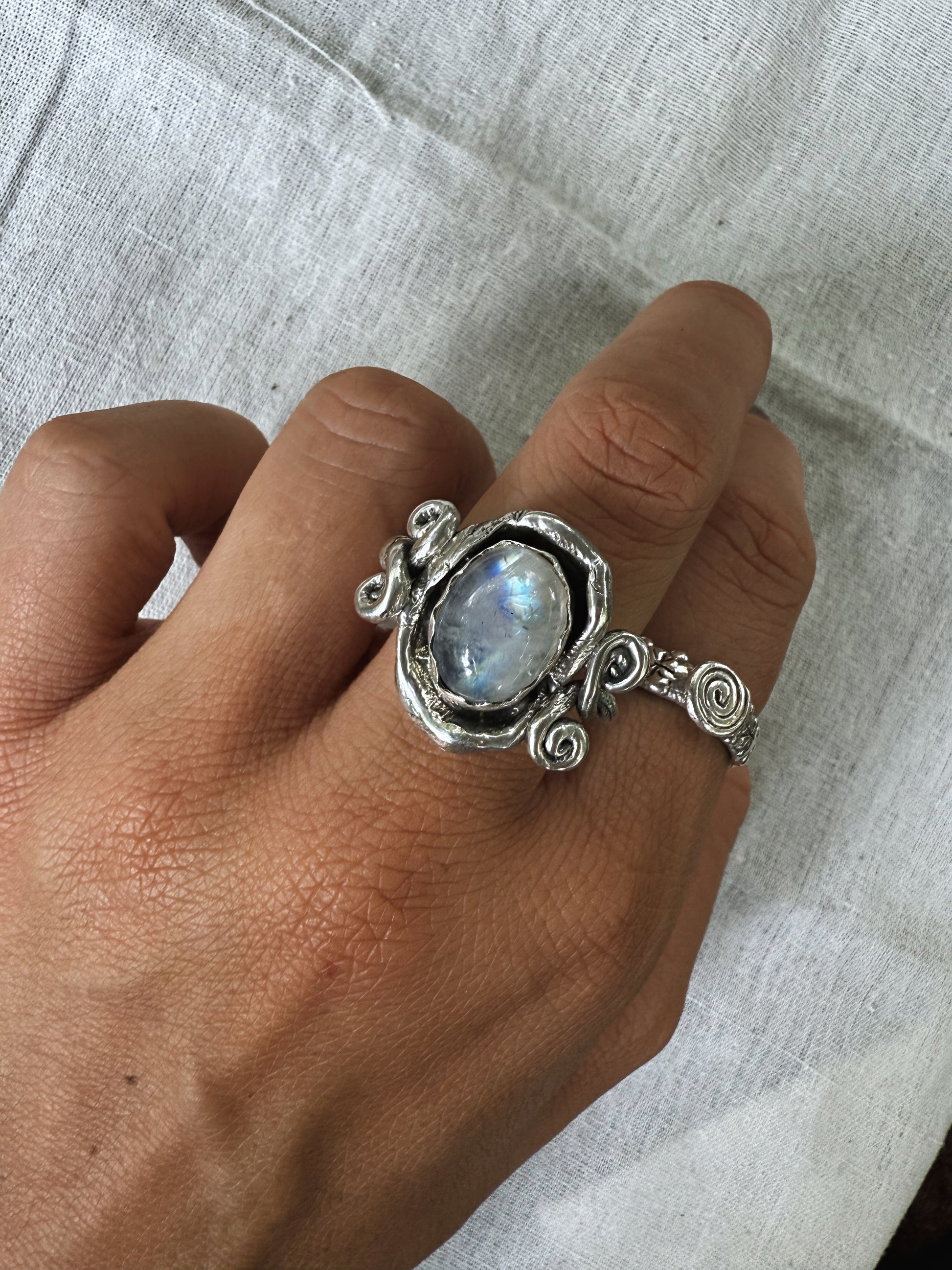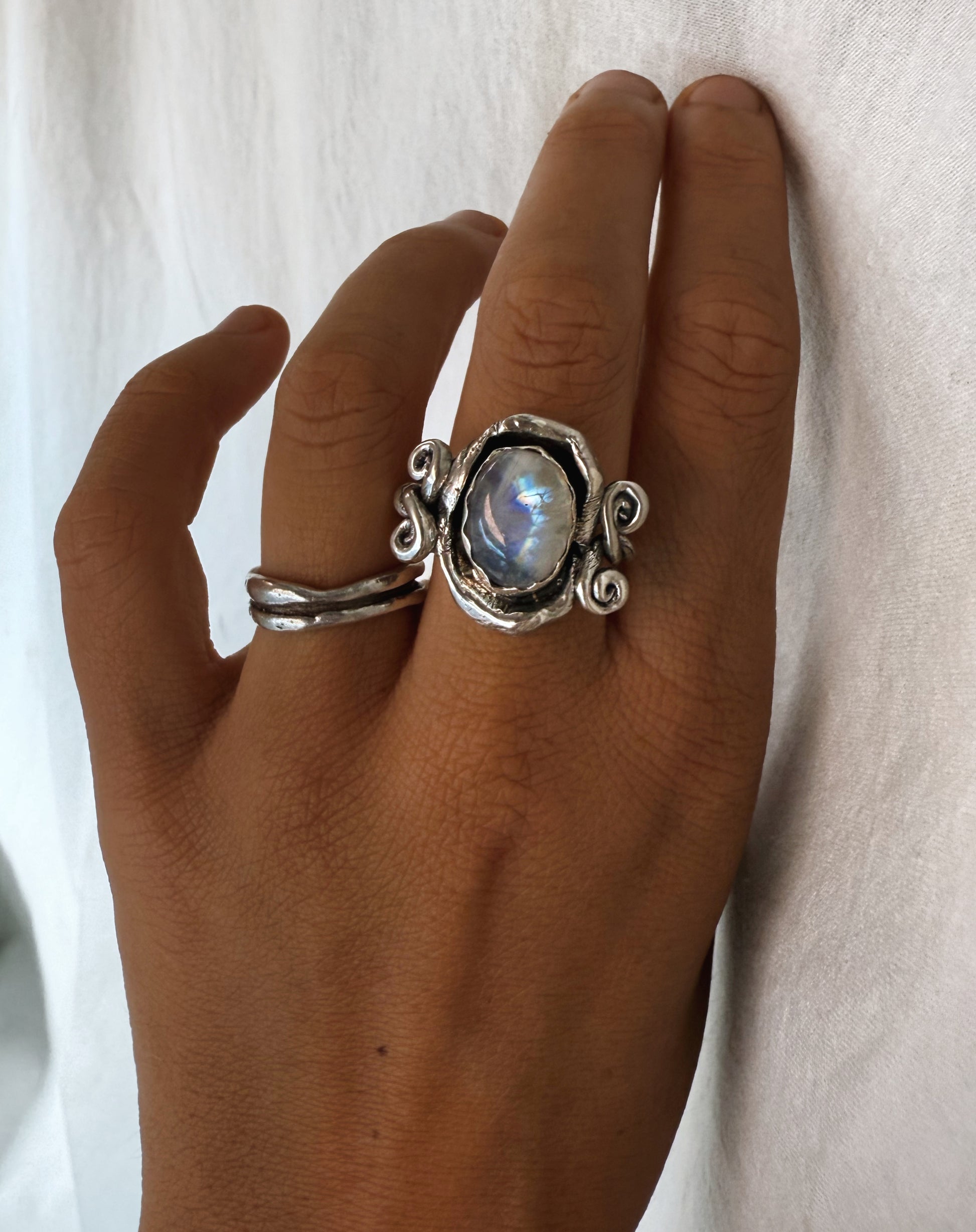 a chunky moonstone rests in a silver hug, like a small dream portal echoing the spinning pond itself, a place where water circles endlessly and hidden thoughts rise gently to the surface. It carries the quiet feeling that life is a dream we’re already inside of, if we let ourselves see it. Its shifting light and vibrant blue glow pull you inward, toward intuition, imagination, and that soft space where reality and dreaming melt into one.