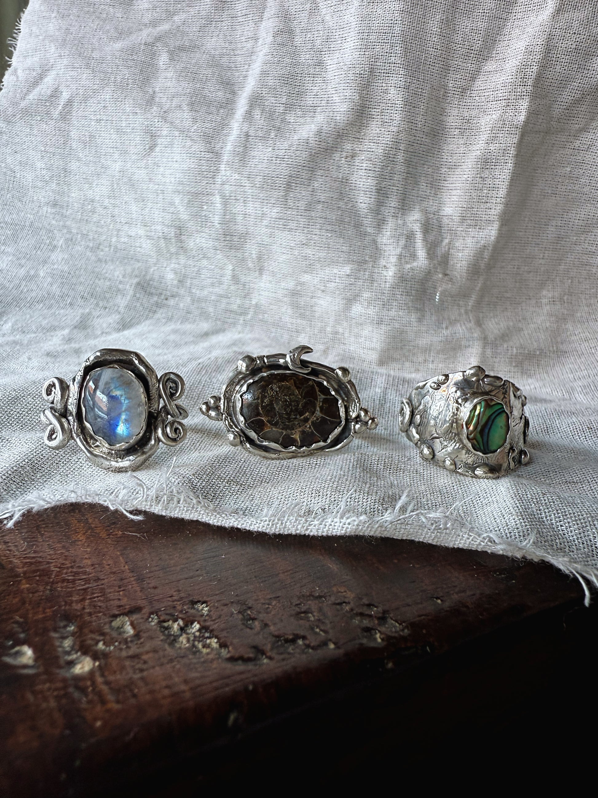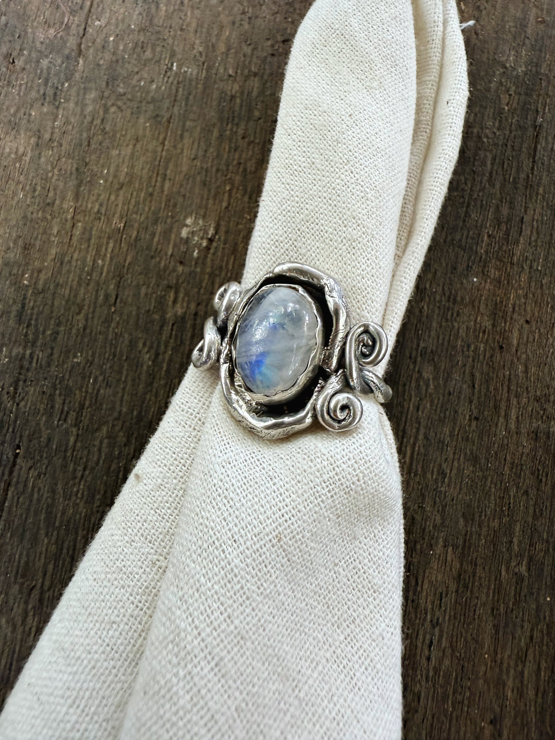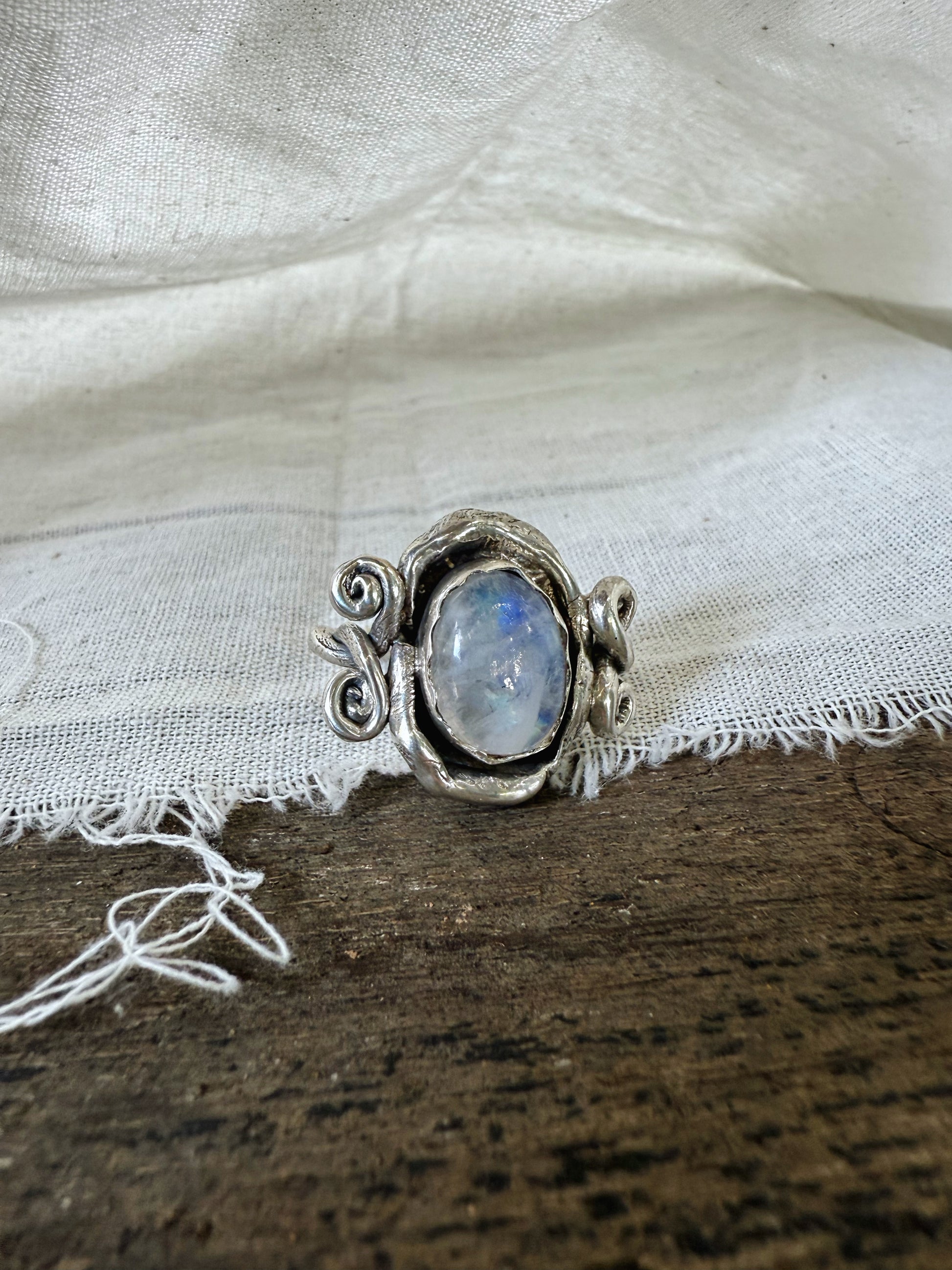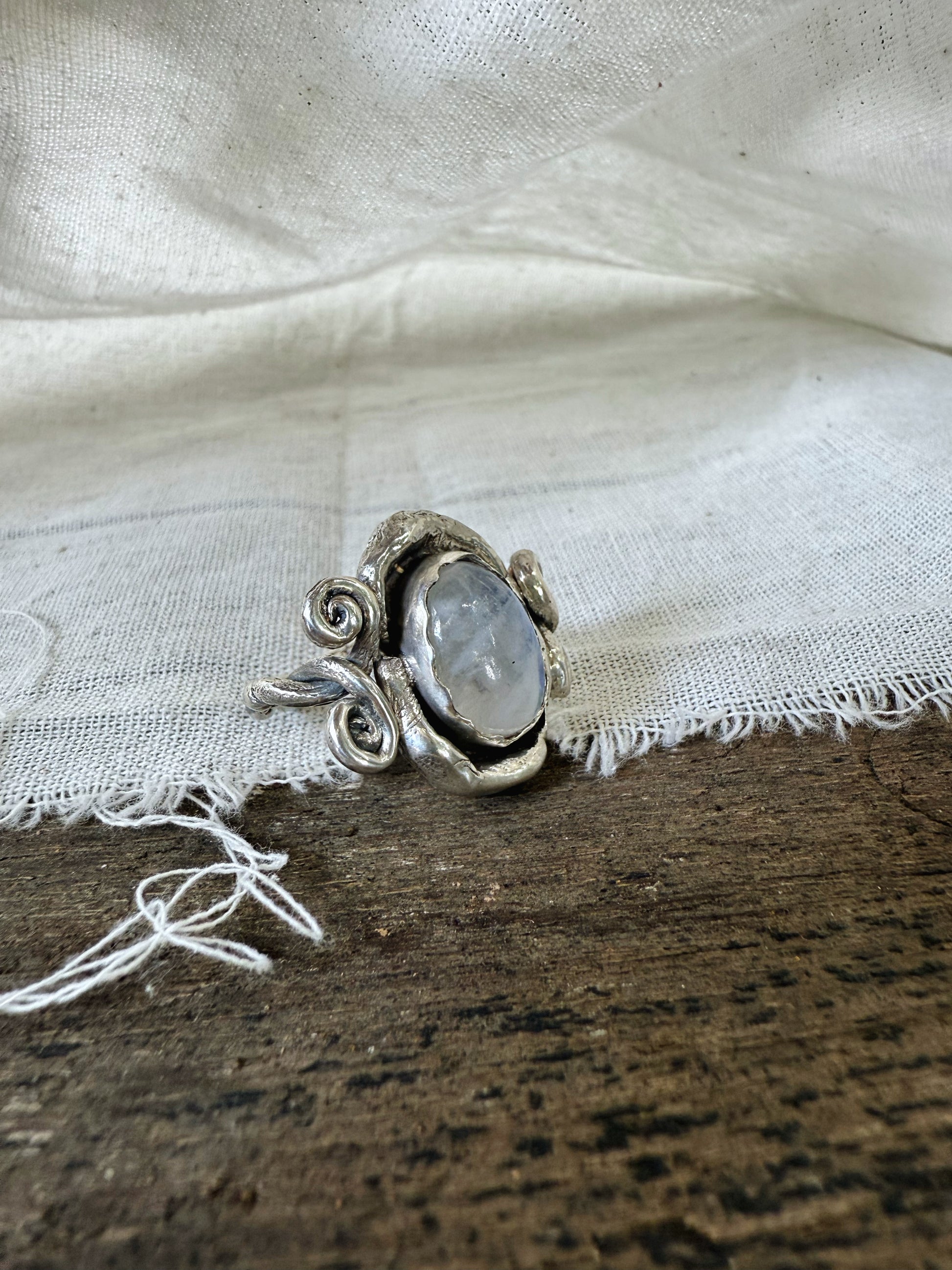 a chunky moonstone rests in a silver hug, like a small dream portal echoing the spinning pond itself, a place where water circles endlessly and hidden thoughts rise gently to the surface. It carries the quiet feeling that life is a dream we’re already inside of, if we let ourselves see it. Its shifting light and vibrant blue glow pull you inward, toward intuition, imagination, and that soft space where reality and dreaming melt into one.