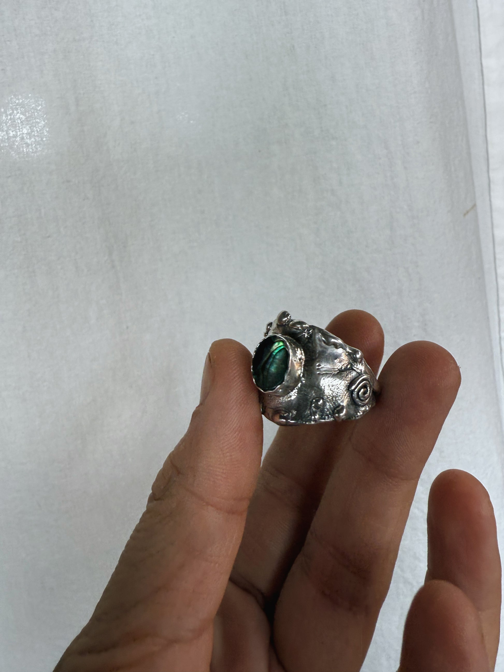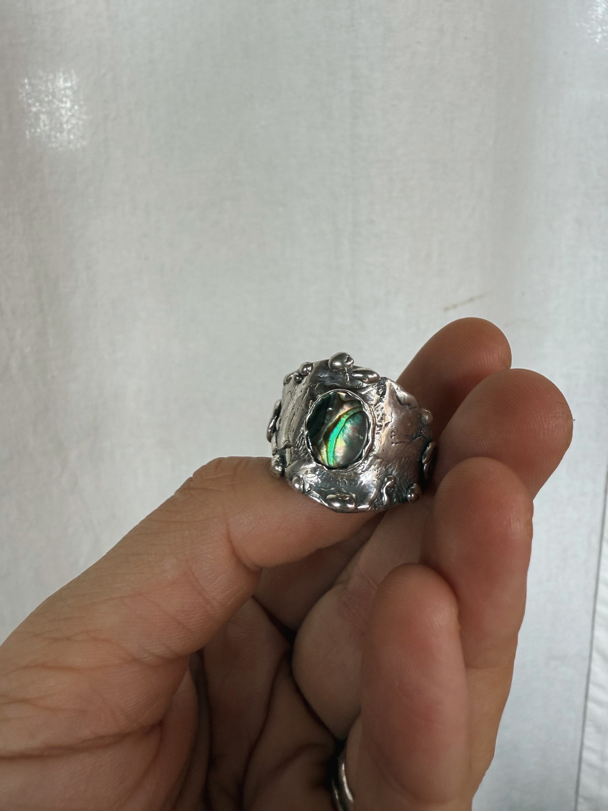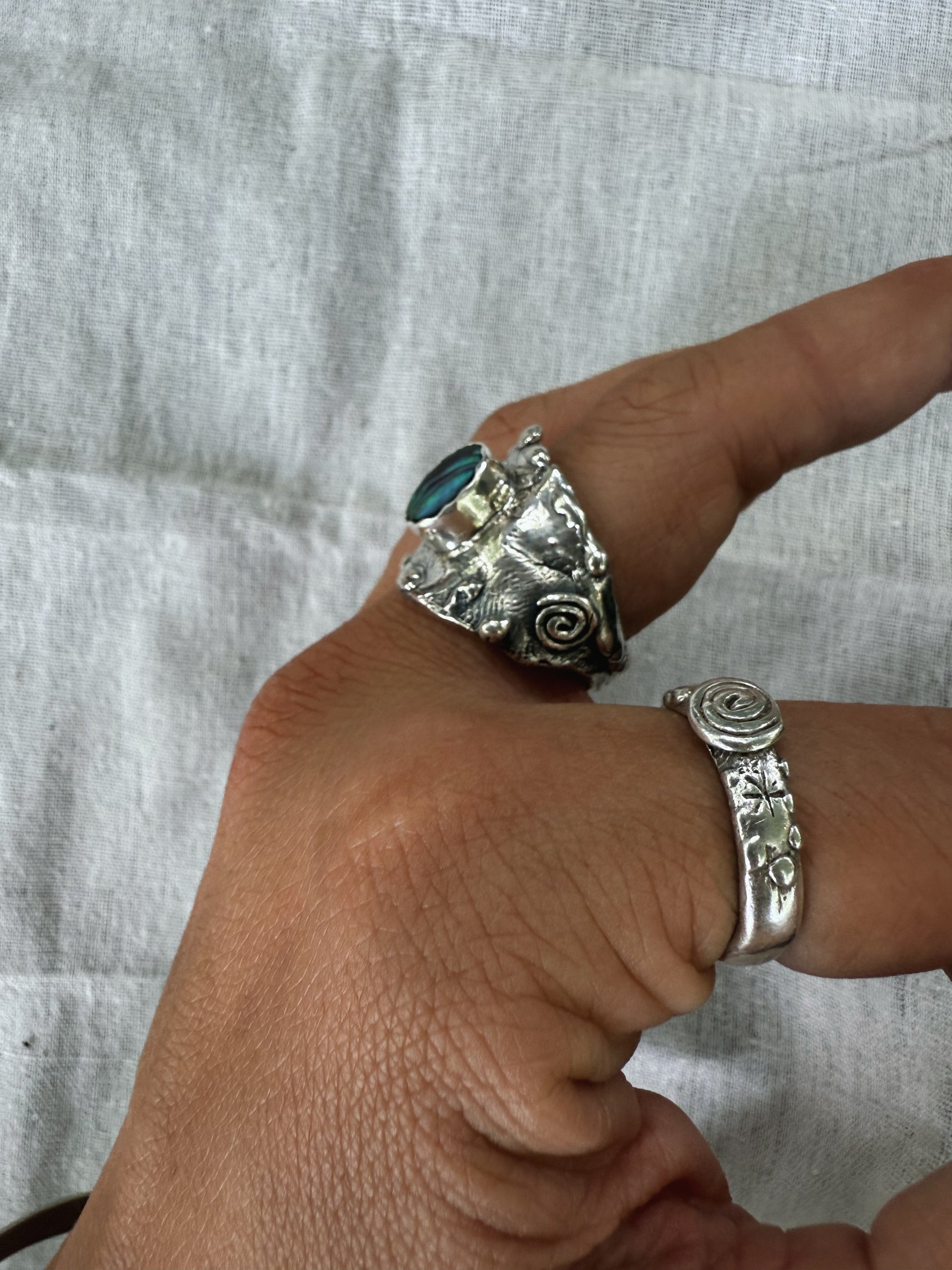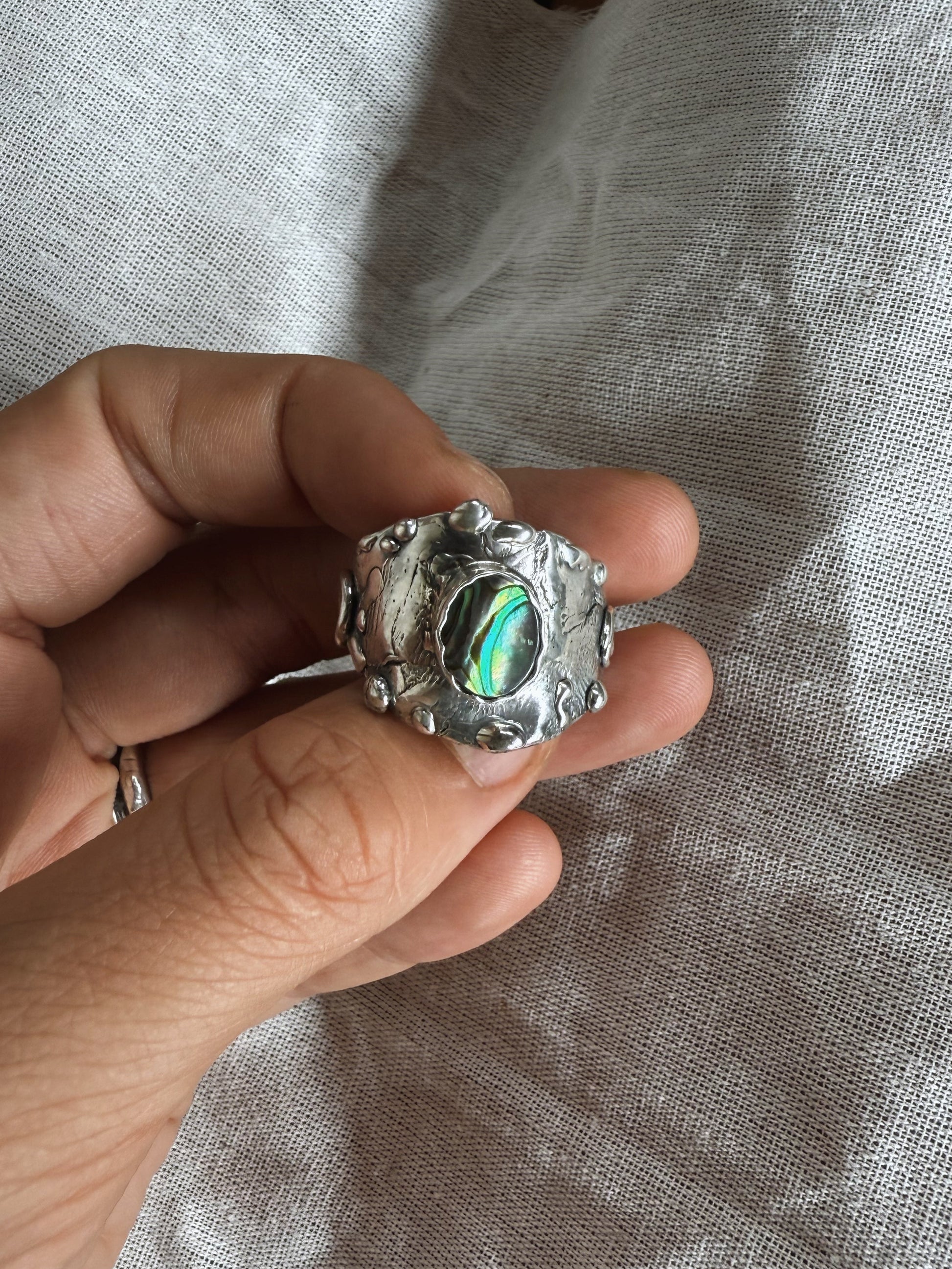 At the centre of this ring, an iridescent abalone shell shimmers like a living fragment of the sea, set within a thick, textured band that is etched with the stories and textures of the world. It carries the sense of a small portal to the power of the present moment, drawing you back into your body and breath. The shell’s ocean light is a gentle reminder to return to the sea often to cleanse your human avatar and spirit, to release what’s heavy, and to begin again in clarity and flow.