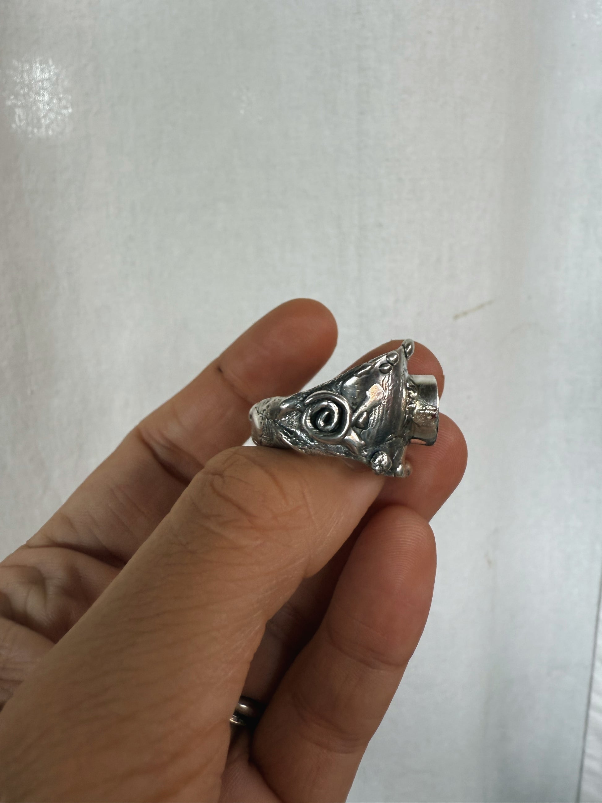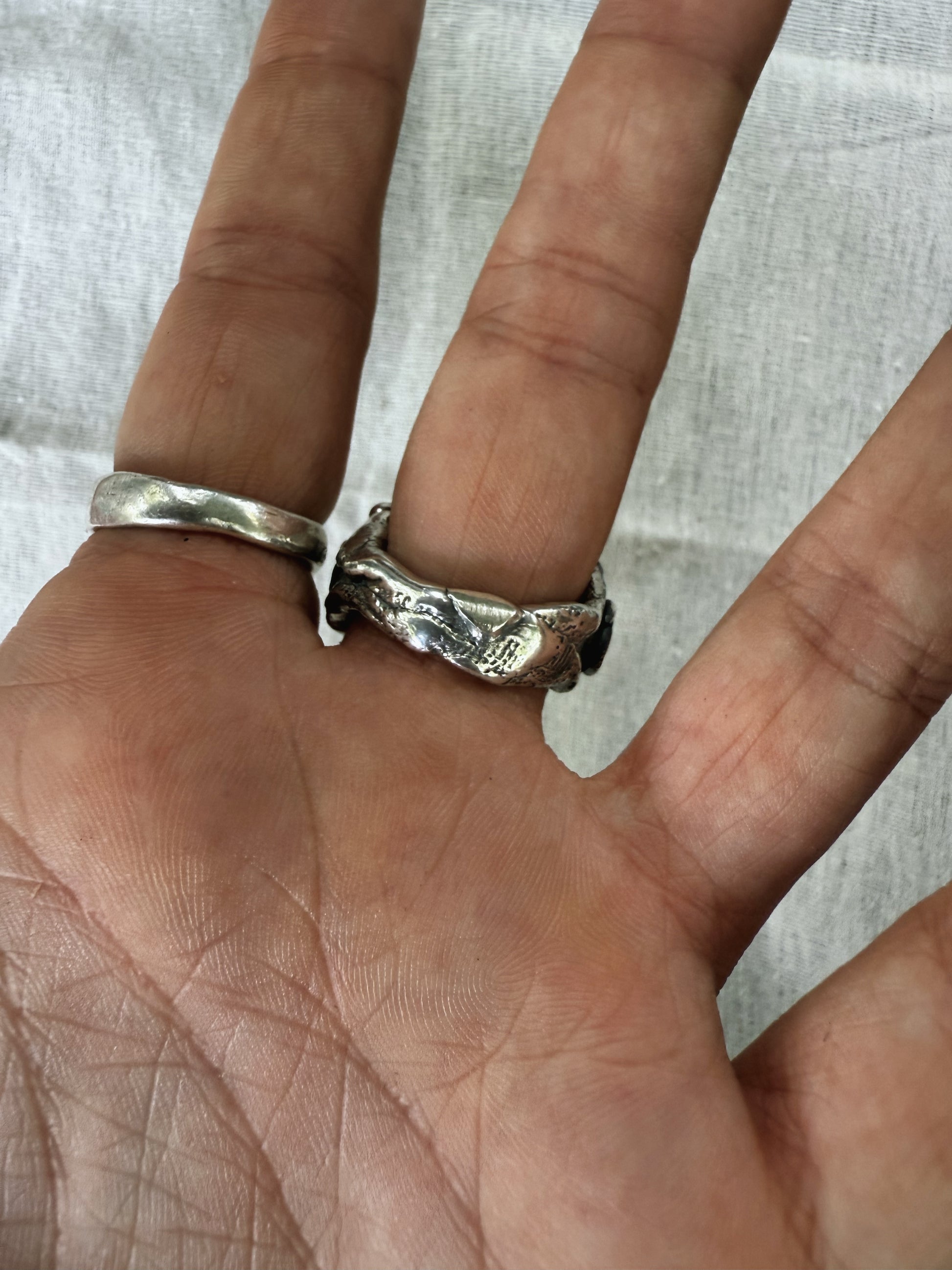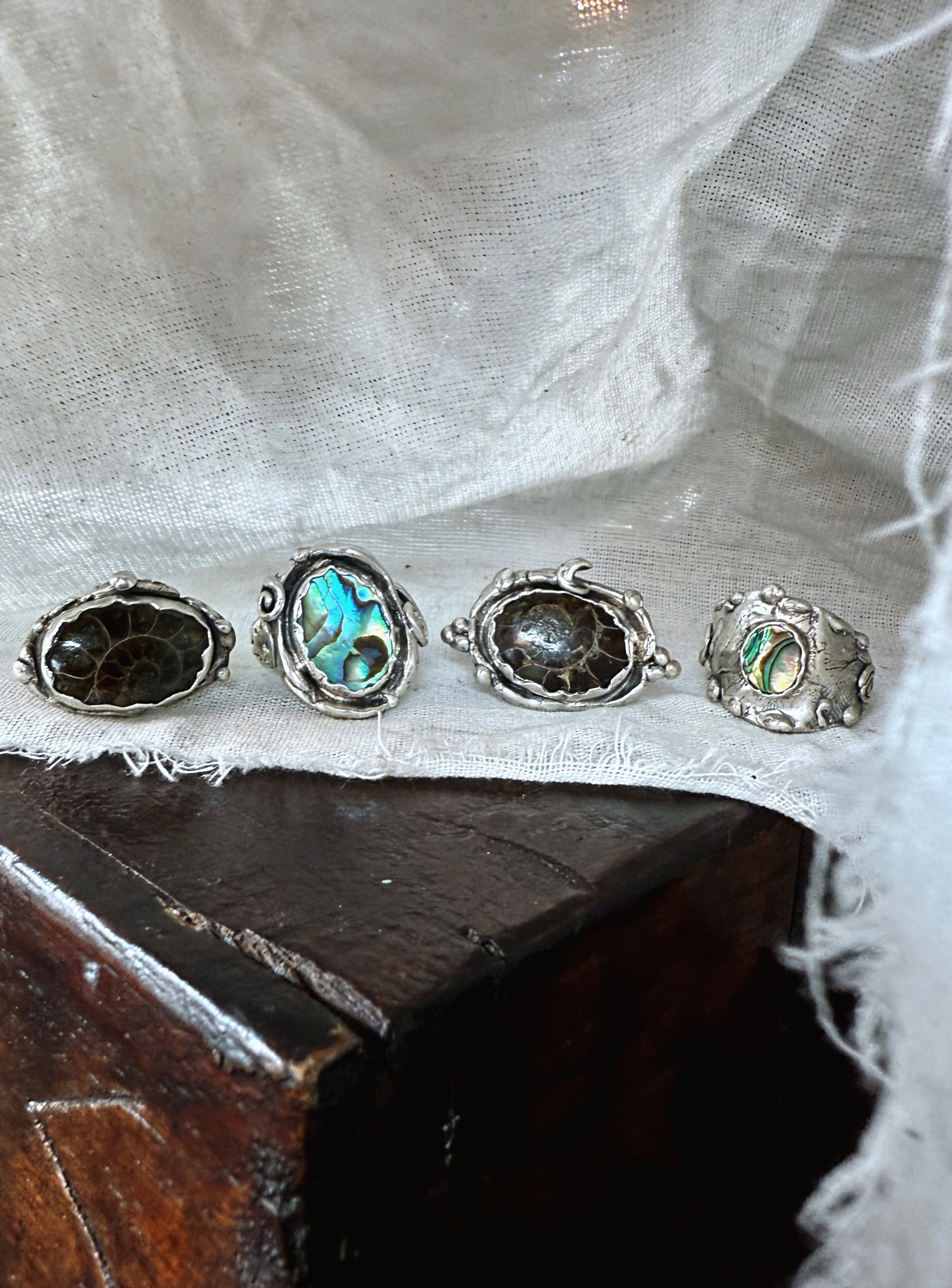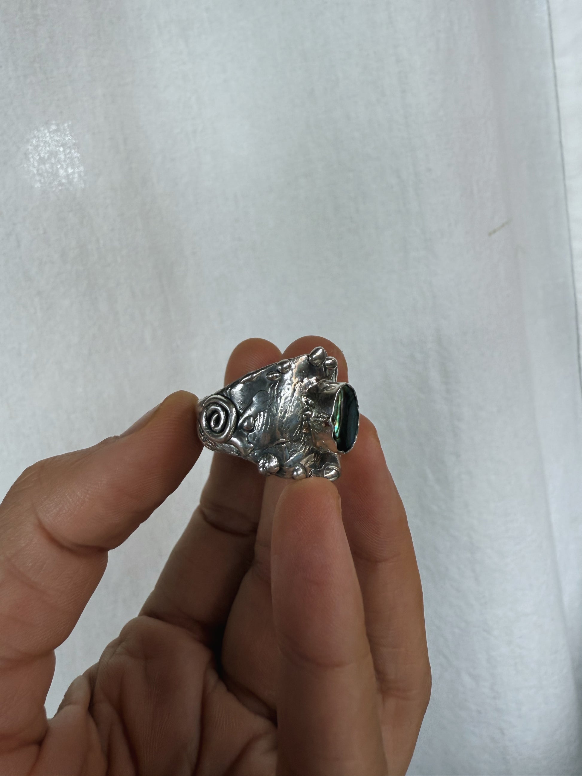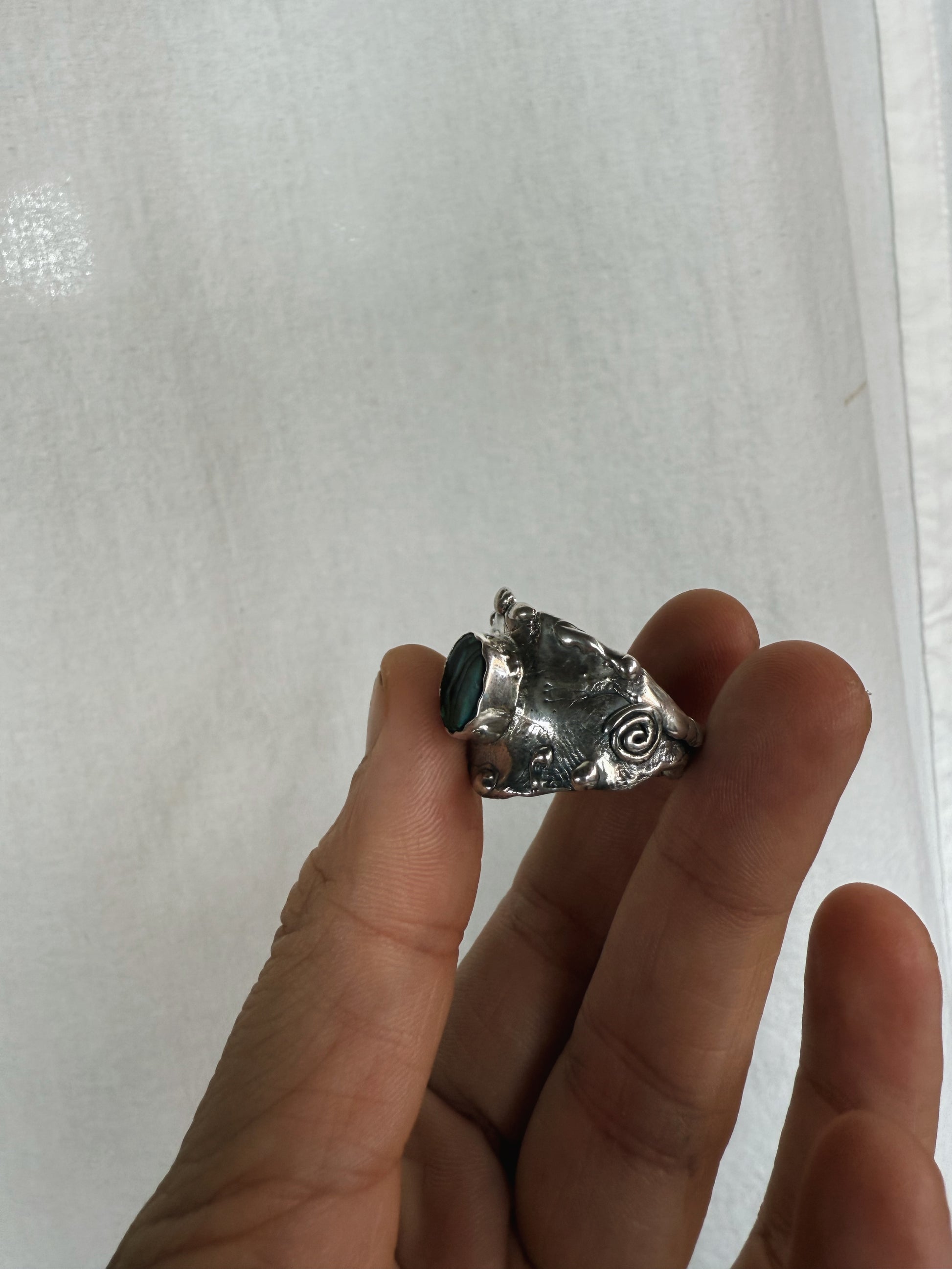 At the centre of this ring, an iridescent abalone shell shimmers like a living fragment of the sea, set within a thick, textured band that is etched with the stories and textures of the world. It carries the sense of a small portal to the power of the present moment, drawing you back into your body and breath. The shell’s ocean light is a gentle reminder to return to the sea often to cleanse your human avatar and spirit, to release what’s heavy, and to begin again in clarity and flow.