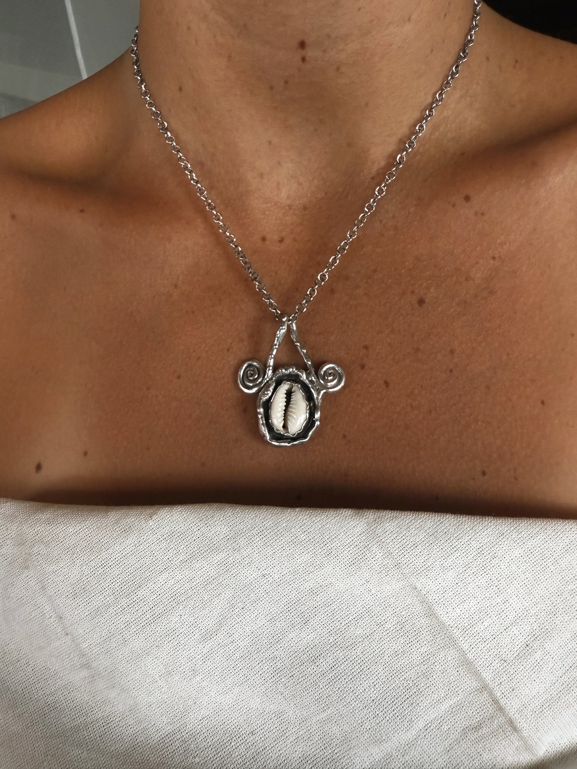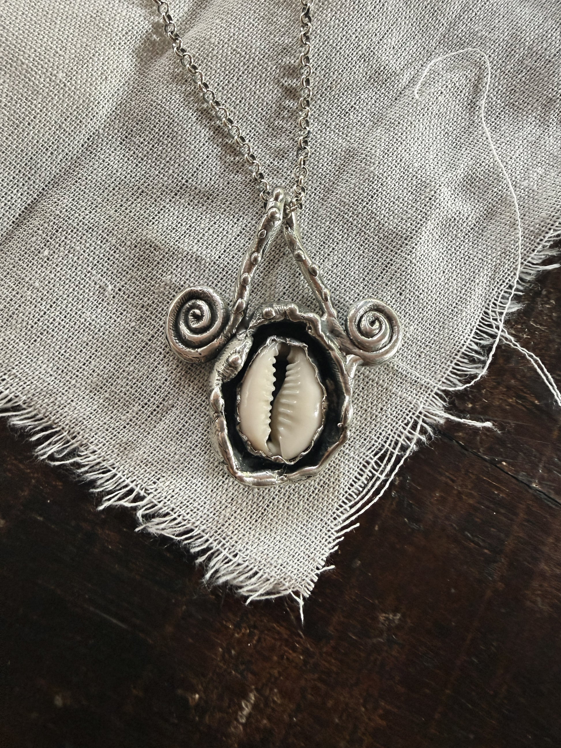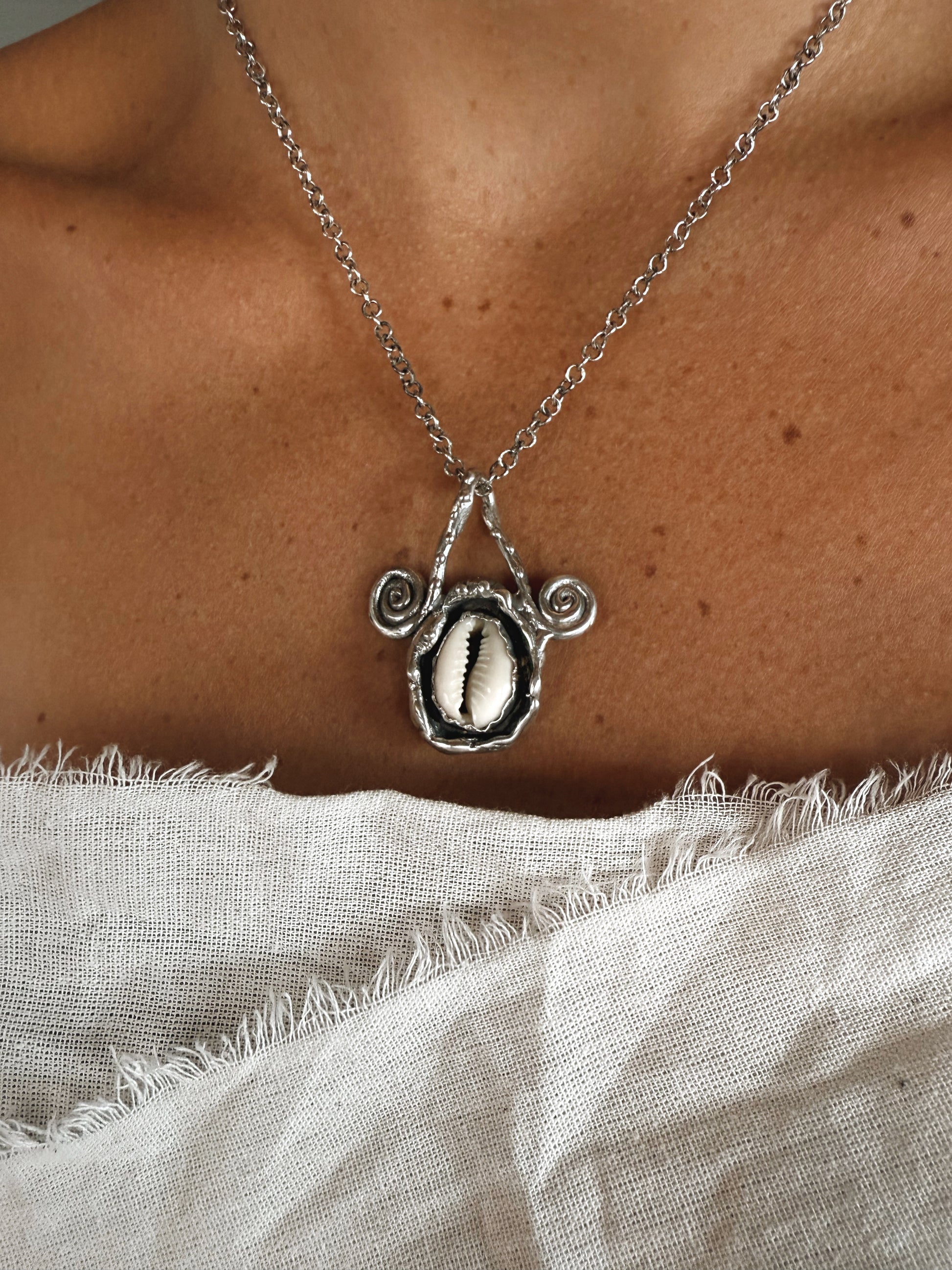 This pendant feels like a small ocean relic resting against the skin, a natural shell held in textured silver, carrying the quiet memory of tides and distant shores. The spirals curl gently on either side like echoes of waves in motion, symbols of flow, return, and the constant unfolding of life.