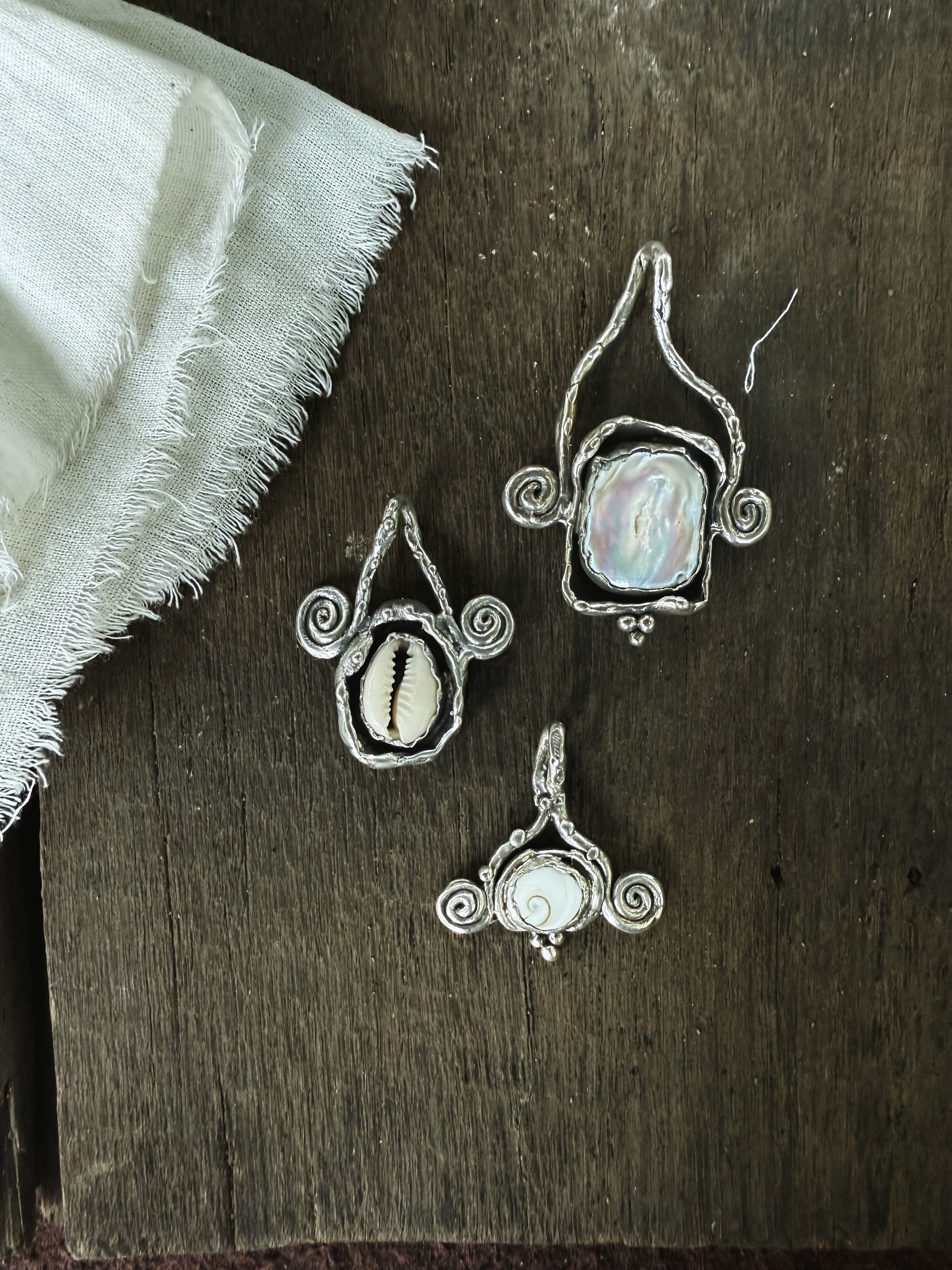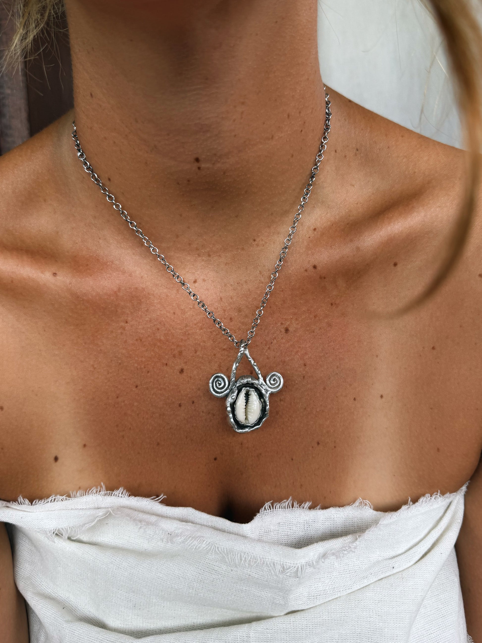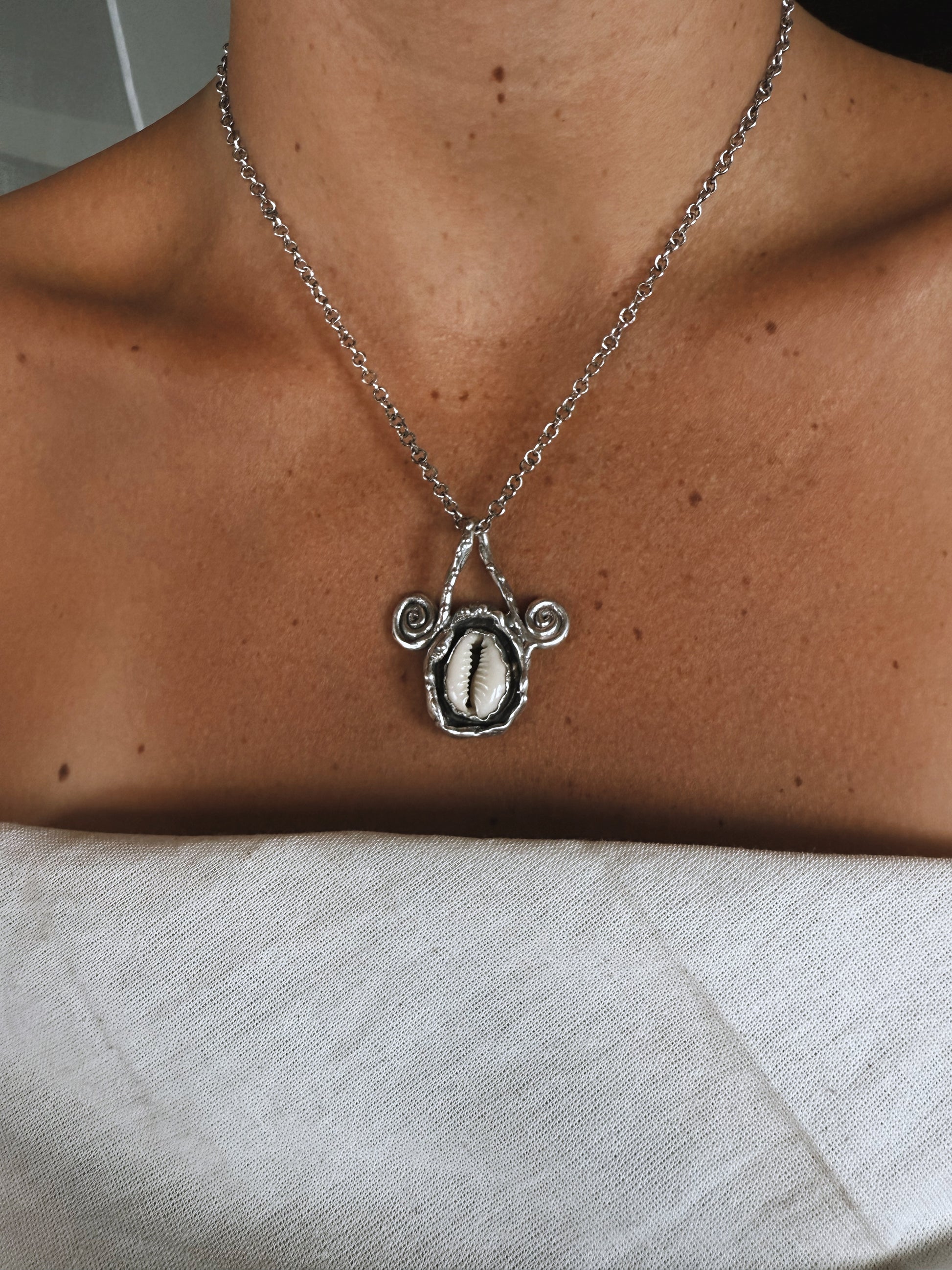 This pendant feels like a small ocean relic resting against the skin, a natural shell held in textured silver, carrying the quiet memory of tides and distant shores. The spirals curl gently on either side like echoes of waves in motion, symbols of flow, return, and the constant unfolding of life.
