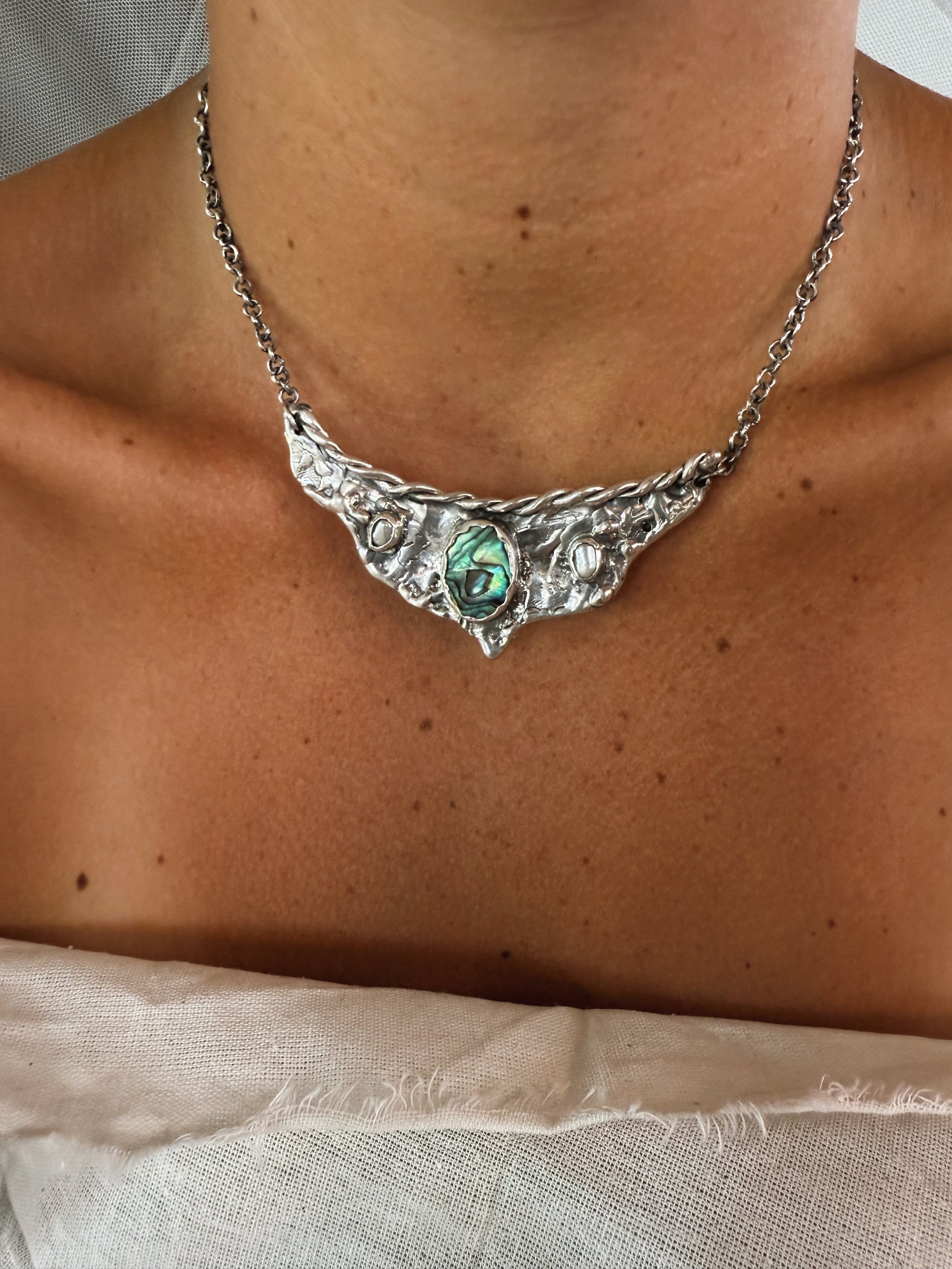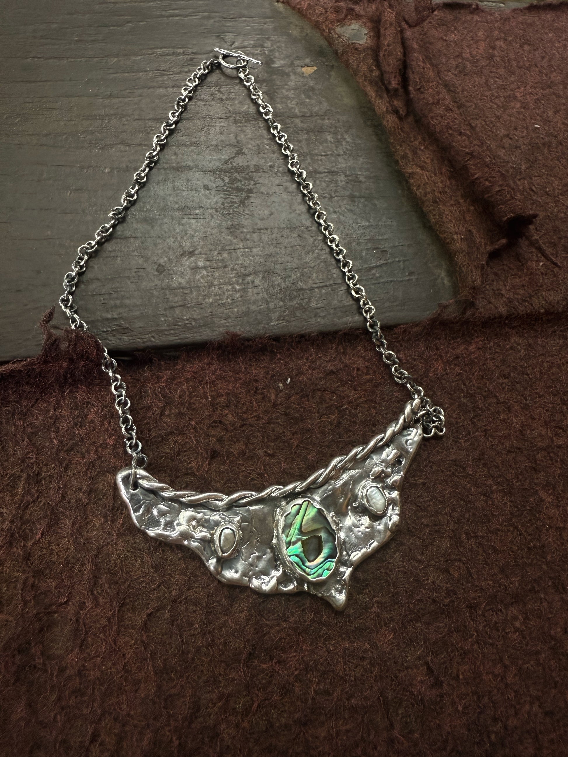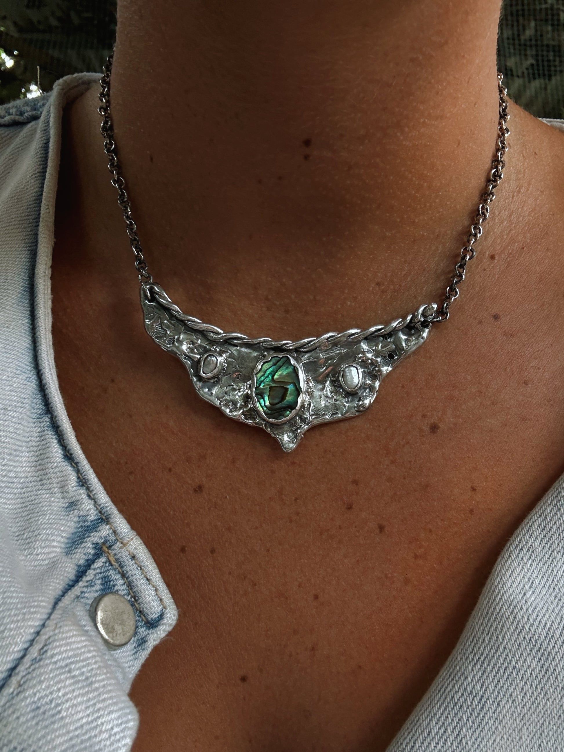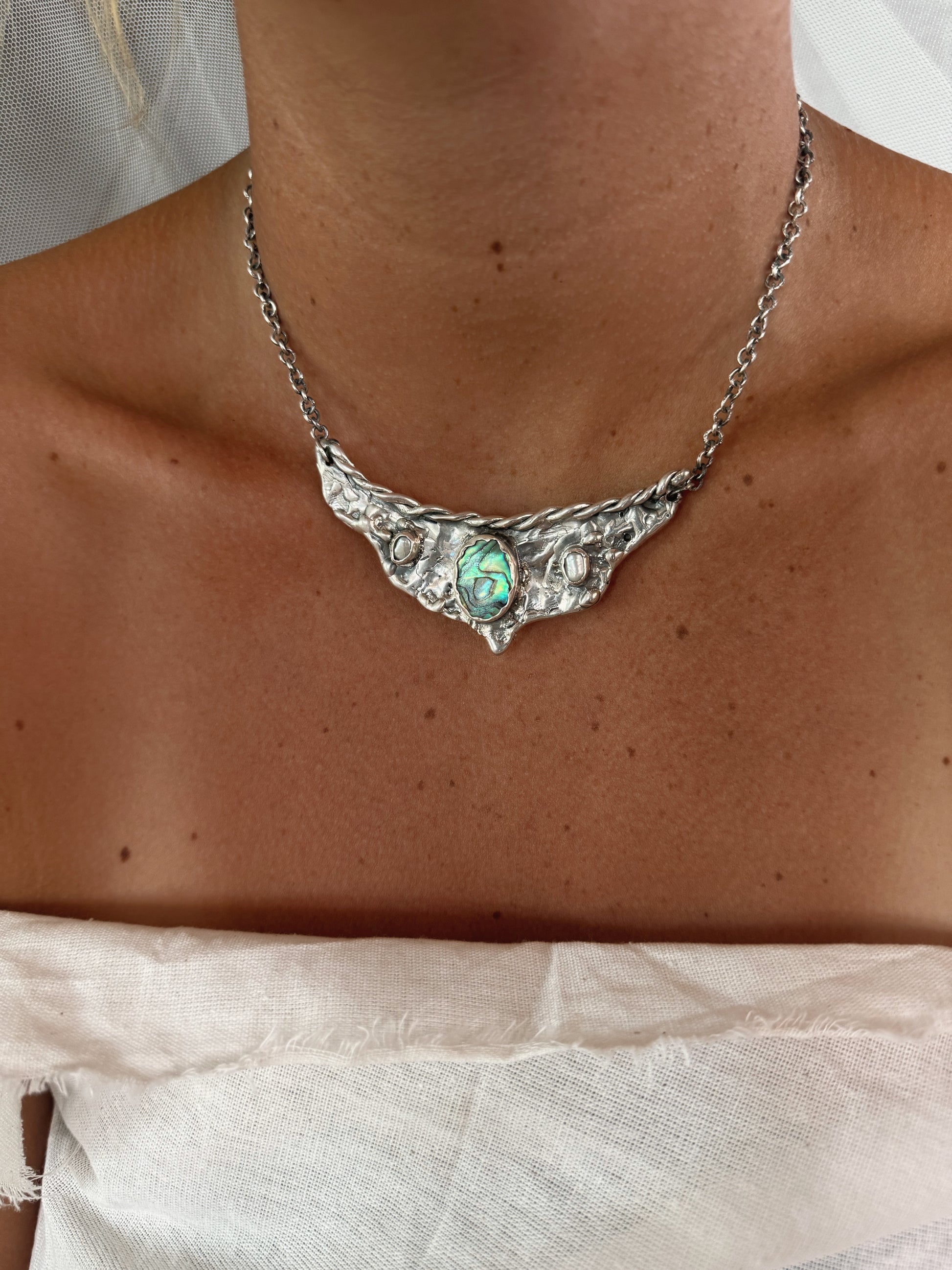 A silver handcrafted vision board worn close to the heart, this piece gathers fragments of sea and light into one wing shaped pendant. A bright rainbow coloured paua shell glows at the centre like an inner compass, decorated with two soft pearls that bring quiet moments of clarity. Textured silver spreads outward like wings unfurled, holding the metaphoric value of possibility and direction. It feels like a wearable reminder to trust your inner sight to move toward what calls you and let your dreams take shape in the present.