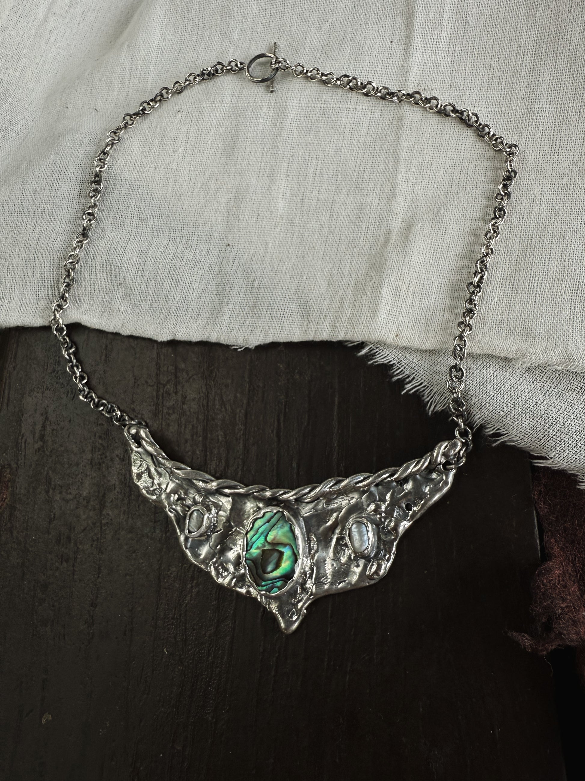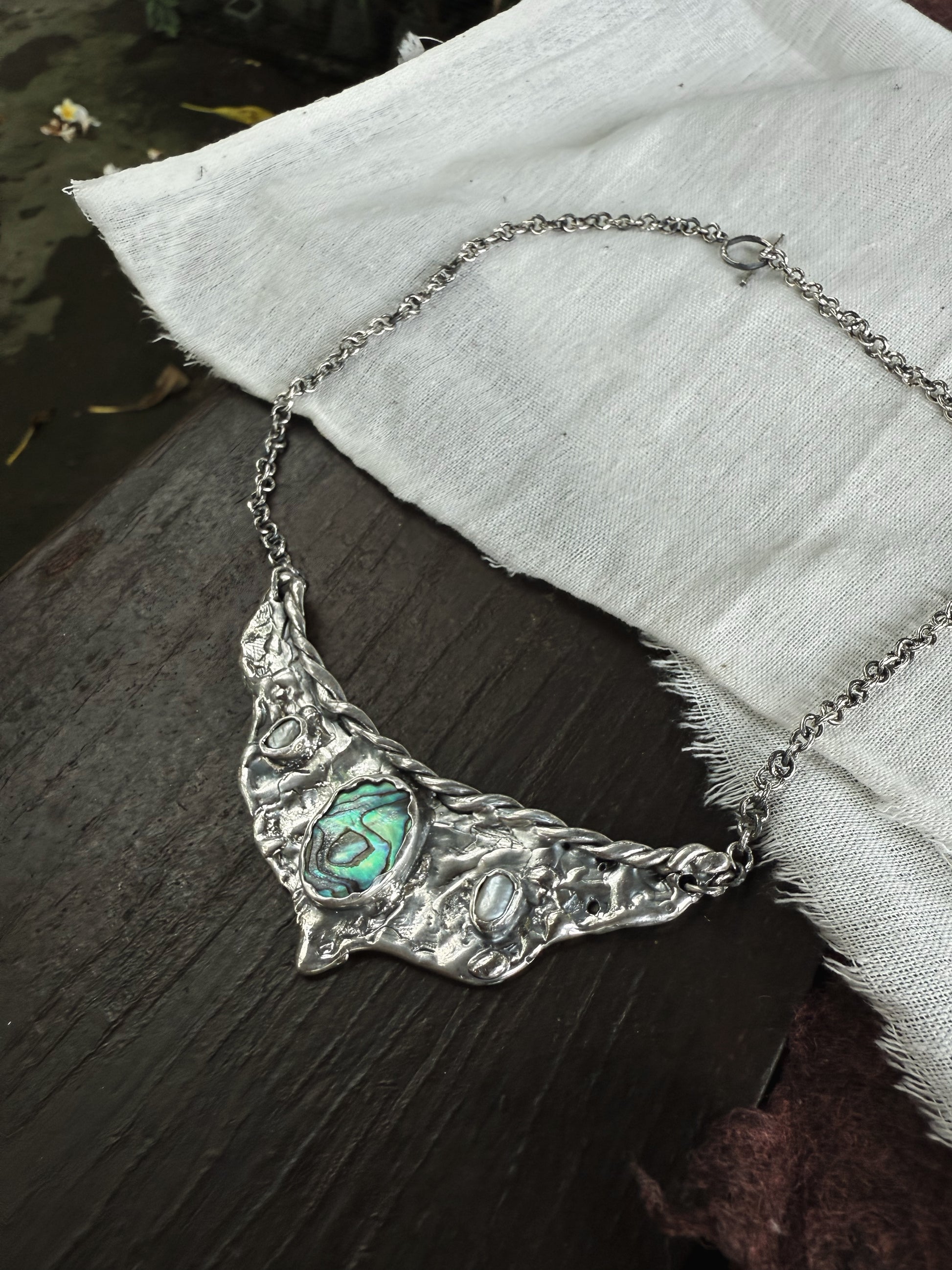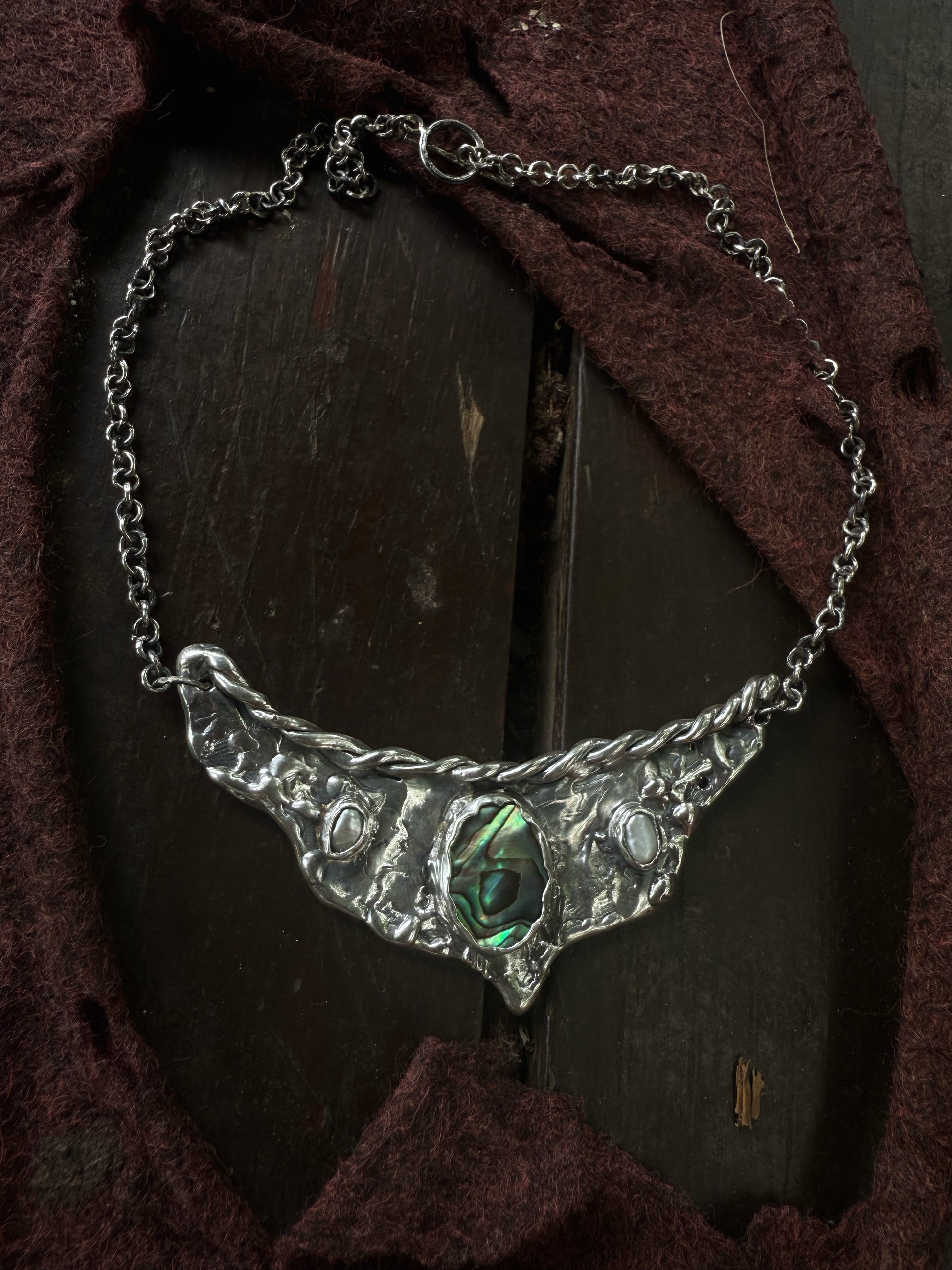 A silver handcrafted vision board worn close to the heart, this piece gathers fragments of sea and light into one wing shaped pendant. A bright rainbow coloured paua shell glows at the centre like an inner compass, decorated with two soft pearls that bring quiet moments of clarity. Textured silver spreads outward like wings unfurled, holding the metaphoric value of possibility and direction. It feels like a wearable reminder to trust your inner sight to move toward what calls you and let your dreams take shape in the present.