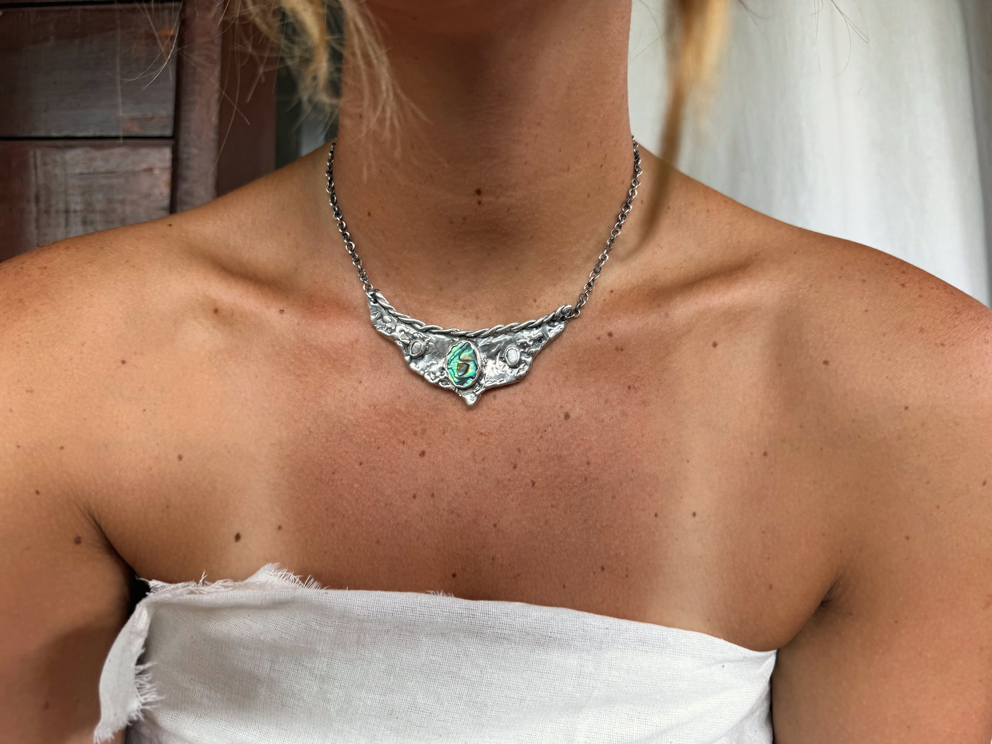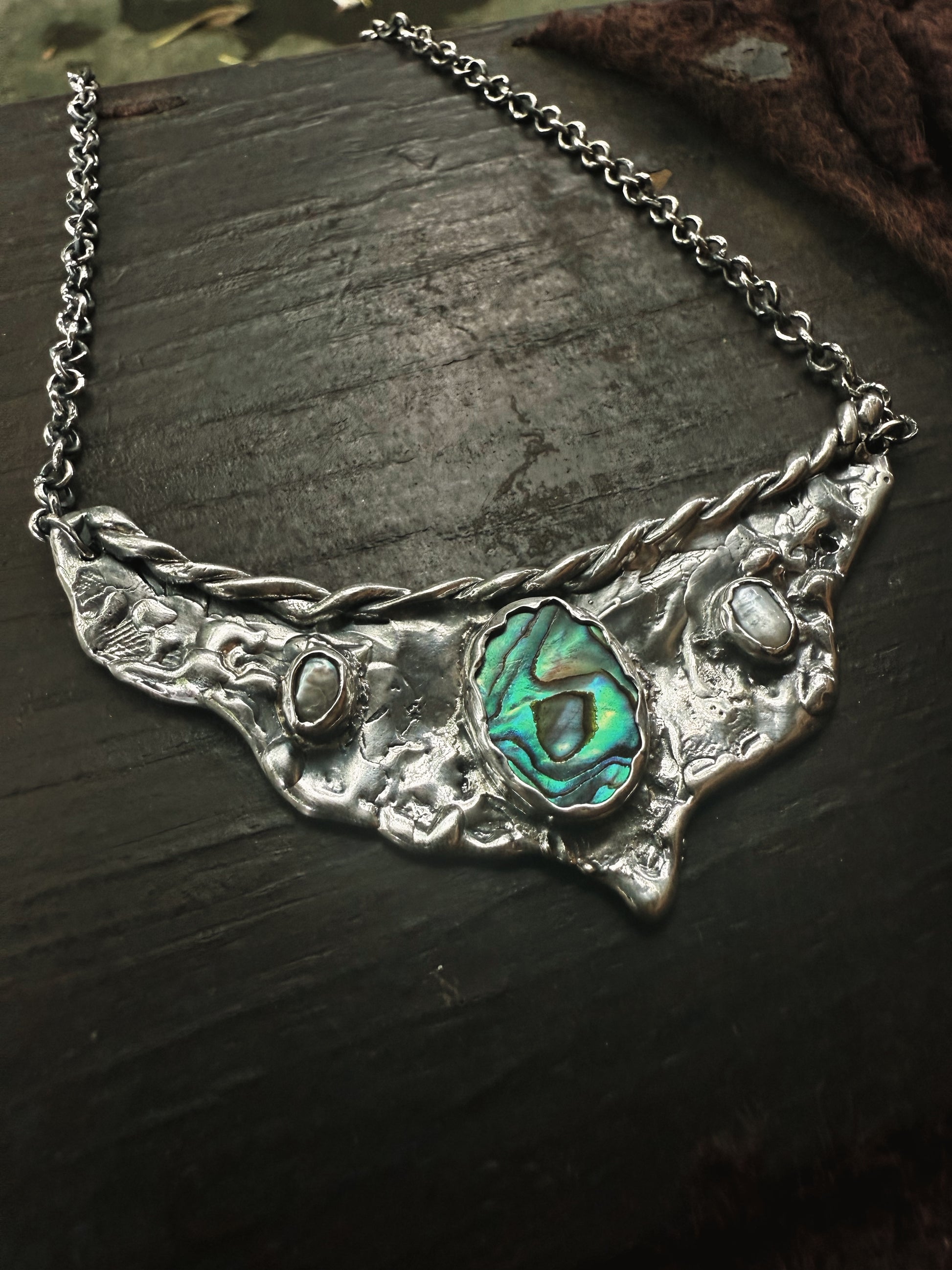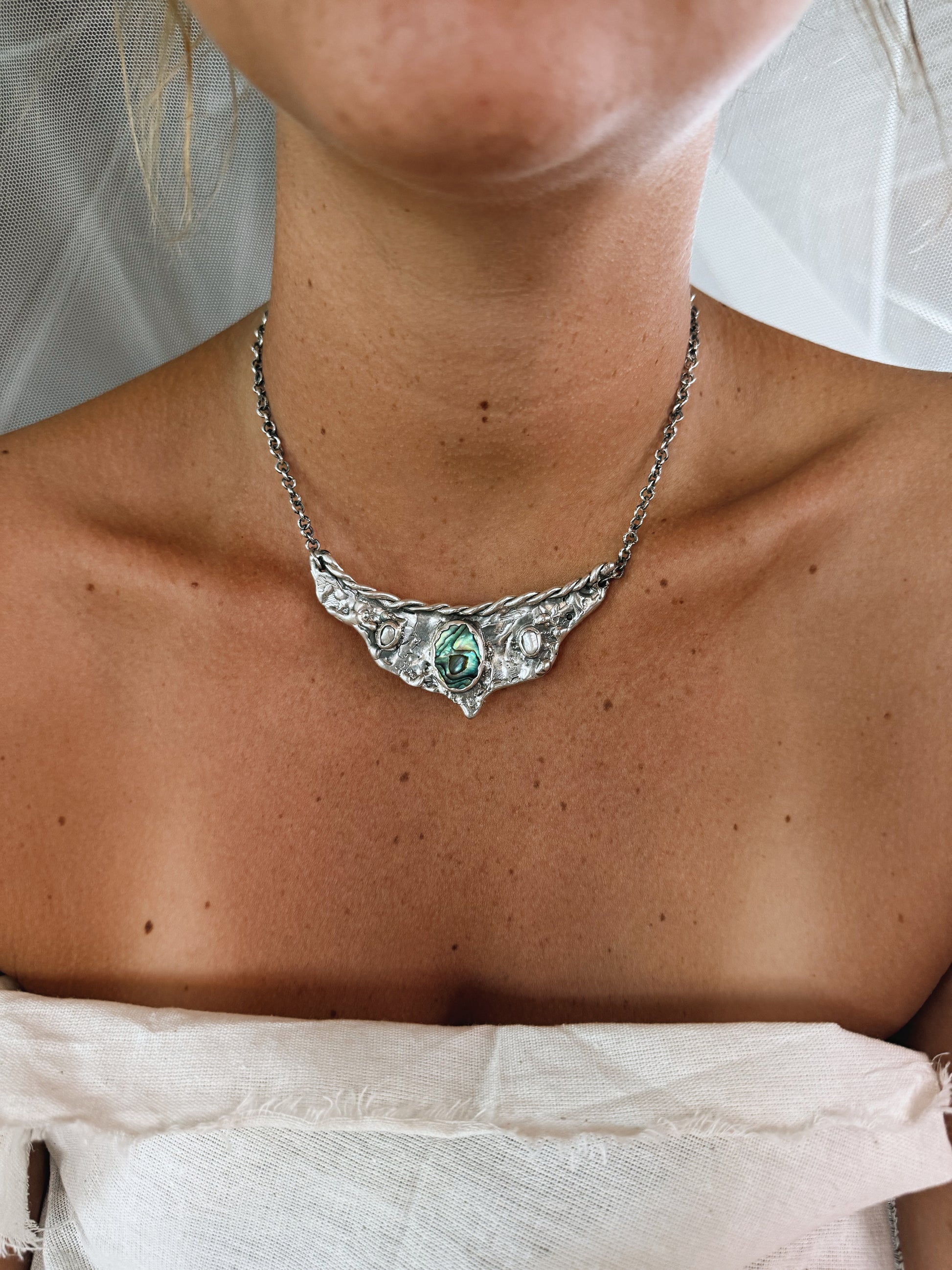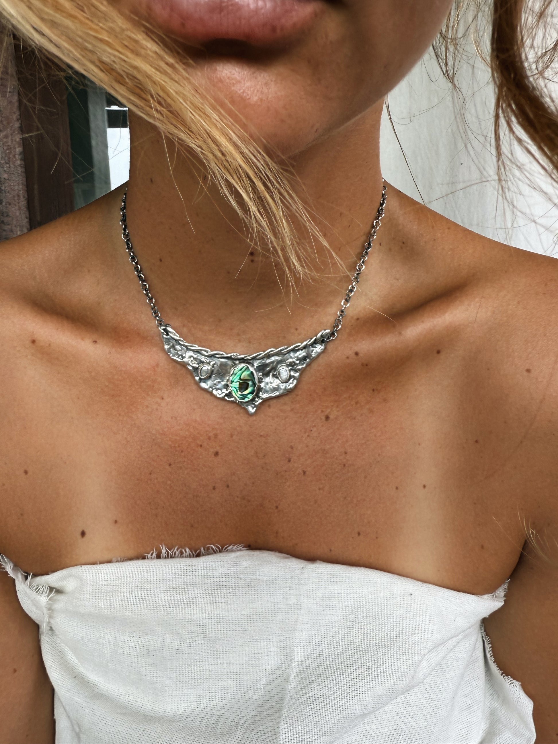 A silver handcrafted vision board worn close to the heart, this piece gathers fragments of sea and light into one wing shaped pendant. A bright rainbow coloured paua shell glows at the centre like an inner compass, decorated with two soft pearls that bring quiet moments of clarity. Textured silver spreads outward like wings unfurled, holding the metaphoric value of possibility and direction. It feels like a wearable reminder to trust your inner sight to move toward what calls you and let your dreams take shape in the present.